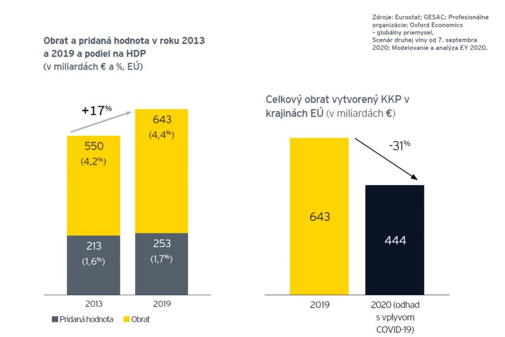 Ešte v roku 2019 bola pritom kultúra a tvorba v plnej sile. S obratom 643 miliárd € a s celkovou pridanou hodnotou 253 miliárd € predstavovala činnosť kultúrneho a kreatívneho priemyslu 4,4 % HDP Európskej únie z hľadiska celkového obratu. Hospodársky prínos KKP bol dokonca vyšší ako prínos telekomunikácií (187 miliárd €), automobilového priemyslu (107 miliárd €) či farmácie (122 miliárd €).