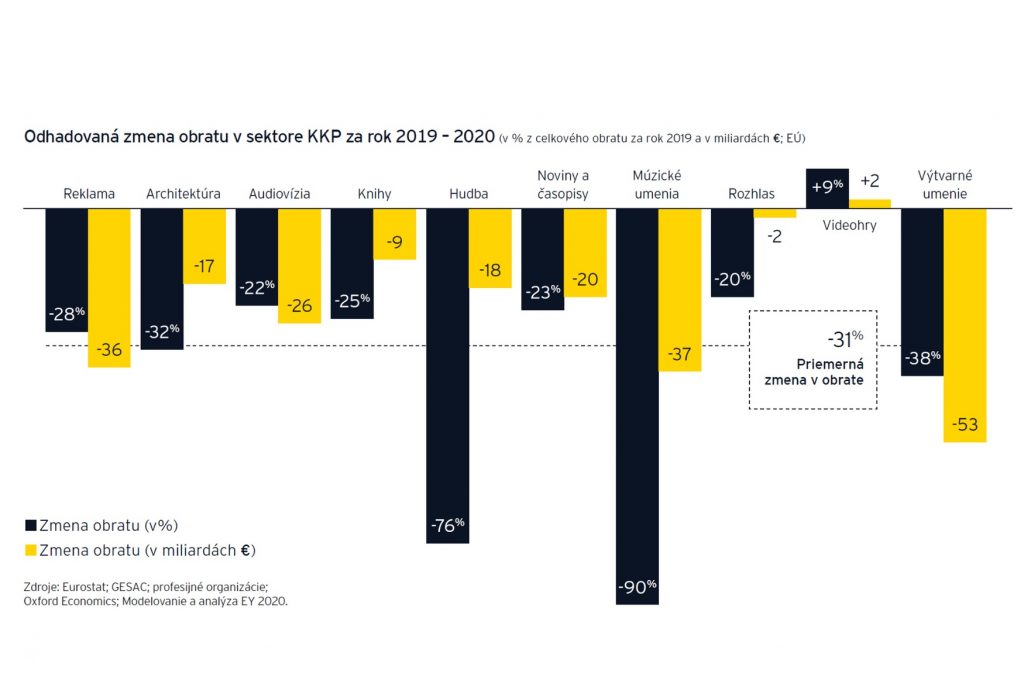 COVID-kríza zasiahla najhoršie oblasť kultúry práve v strednej a východnej Európe a otrasy sú citeľné vo všetkých kultúrnych a kreatívnych odvetviach. Najviac postihnutými sú múzické umenie (- 90 %) a hudba (- 76 %). Hneď za nimi nasleduje výtvarné umenie, architektúra, reklama, knihy, tlač a audiovizuálne umenie, ktorých príjmy v porovnaní s rokom 2019 klesli v rozmedzí 20 % - 40 %. Jediná oblasť KKP, ktorá si dokázala udržať svoje príjmy v roku 2020 bola oblasť videohier (+ 9 %).