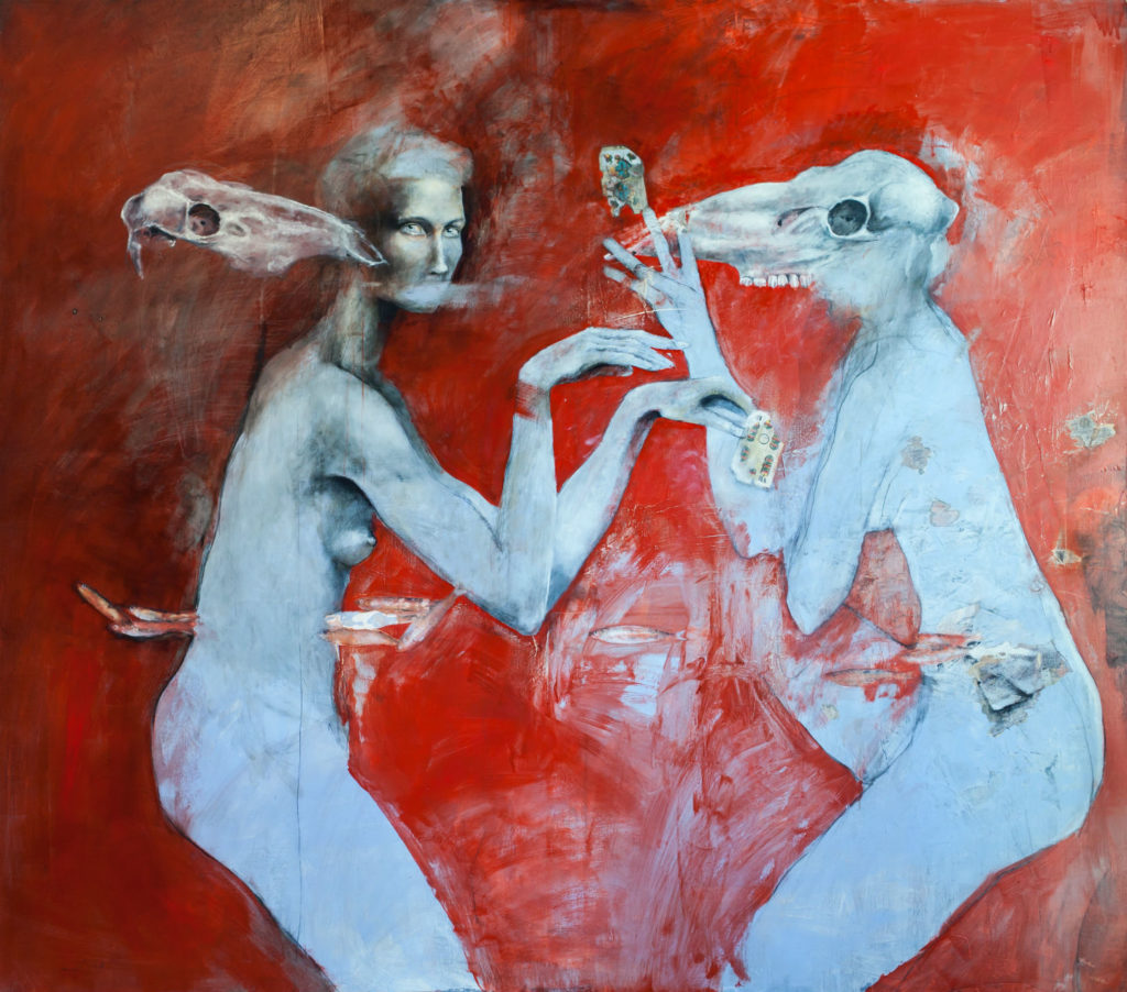 Figurálne motívy, (či už ide o solitér, alebo skupinovú kompozíciu) maľuješ na kontrastnom tmavom pozadí. Raz sú to ľudia, inokedy démoni, i akási maškaráda hybridných bytostí v spojení tela ľudského a zoomorfného, často zámerne aj nedokončeného. Niečo medzi človekom a zvieraťom, občas fantómom. Čo ťa najviac inšpiruje, aké témy spracovávaš a kam smeruje tvoja výpoveď? Od narodenia Krista sa ľudstvo nezmenilo, ľudia sú stále rovnakí. Inšpirujú ma samotní ľudia charakteristikami svojich pováh. Ľudské telo vnímam ako krajinu, ktorá je rozmanitá. Na každom ľudskom tele sa dá nájsť niečo pekné. Veľmi ma tiež fascinujú biblické motívy, momentálne pracujem na cykle Krížovej cesty. Zhrnul by som to do jednej vety: „Kde ti je začiatok/koniec človek ?“