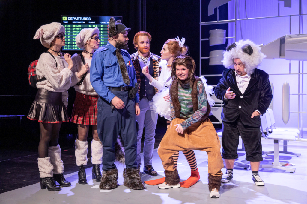 Scéna a kostýmy (Lucia Šedivá) sú jednoduché a zároveň dômyselné. Zvieratká sa stretávajú v gejte – priestor je čistý, v strede iba letištné kreslá, po stranách digitálne informačné tabule s odletmi, ktoré sú všetky zrušené. Na horizonte je situovaný veľký plast/šablóna ešte neposkladaného modelu lietadla, akoby práve vytiahnutého zo škatule. V strede rotujúcim pohybom sa cez súčiastky evokujúce turniket pohybujú postavy. Kostýmy sú takmer civilné prispôsobené naturelu jednotlivých pováh a vizuálu zvierat s atribútmi živočíšnej ríše (uši, chvosty, blany/plutvy). Ovce sú v krátkych sukničkách a štucniach s ruksačikmi a okuliarmi, Pes má uniformu esbeeskára, Hus je v okázalo a nevkusne našuchorených šatách s pásikavými pančuchami, Tiger je elegán v saku, so šatkou pod krkom, opica má ležérny outfit v zemitých farbách, Panda čierny oblek a bielu parochňu a Líška je odetá ako rebelka so zrzavými dredmi na hlave.