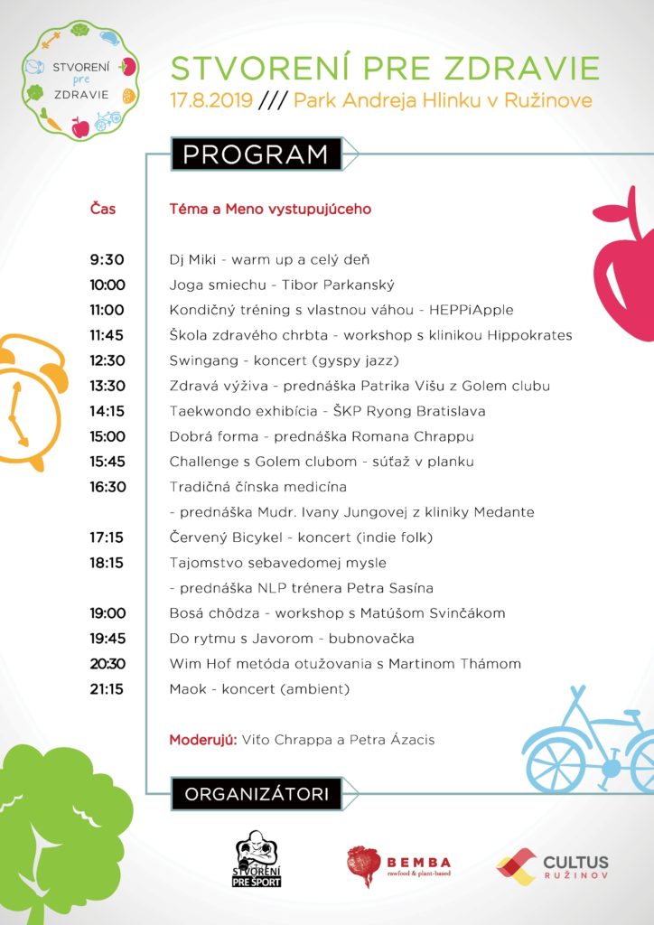 Letné kiná, filmové premiéry, hudobné festivaly a koncerty, ale aj akcia Stvorení pre zdravie obohatená a skvelú muziku. To je víkend, ktorý kultúre nahráva!Odporúčaná akcia: Stvorení pre zdravie - parku Andreja Hlinku v bratislavskom Ružinove, sobota 17. augusta, 2019, od 09:30 - celodenná akcia Minulý rok ukázal, že o akciu Stvorení pre zdravie majú záujem všetky generácie ľudí – od detí, cez mladých, strednú vekovú kategóriu, až po tú najstaršiu. Prednášky, zdravý jarmok, športové aktivity či hudba – každý si našiel to svoje, všetkých však spájalo jediné: nájsť si v tejto rýchlej dobre pre seba kúsok času a spraviť niečo pre svoje zdravie. A k tomu relaxovať pri príjemnej muzike. Pozrite si celodenný program: