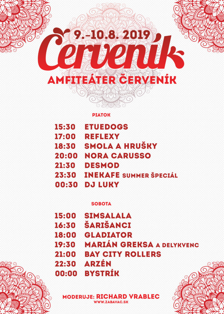 Amfiteáter v Červeníku rozpália aj kapely Gladiator, Inekafe s projektom Vitaj! 20 rokov špeciál, Arzén, Smola a Hrušky, Šarišanci, Nora Carusso, speváci Marián Greksa, Bystrík a ďalší. Programom bude sprevádzať moderátor Richard Vrablec.