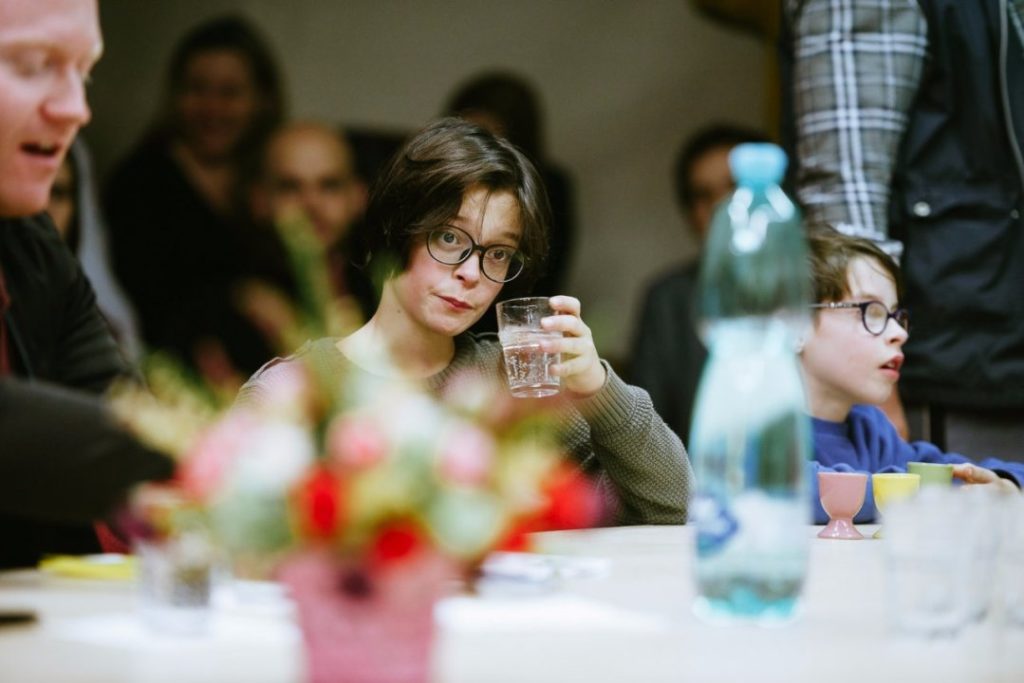 Zatiaľ, čo za stolom prebieha dynamická vrava, dianie sa zastaví iba v jednom momente, keď mladá žena vyvolá poplach, že ide rodiť. Susedia ju kladú na stôl, nastane panika, niekto volá sanitku, iný je v šoku, niekto je nápomocný, iní sa dištancujú, padne poznámka „práve teraz na schôdzi?“, skrátka v tomto krátkom momente opäť vypláva na povrch diapazón pováh. Scéna je interpretovaná snivo, akoby vo filmovom spomalenom zábere, herci v pohybe plávajú ako v beztiažovom stave, spomaľujú gestá, kroky, reč, objaví sa aj dym a výrazné svietenie situácie a dej aj výtvarnosť sú zrazu v inej atmosfére a nálade. Akoby prichádzajúci nový život zastavil na chvíľu čas. Všetko sa zas vráti do pôvodnej nálady, keď mladá žena oznámi, že to bol len planý poplach.
