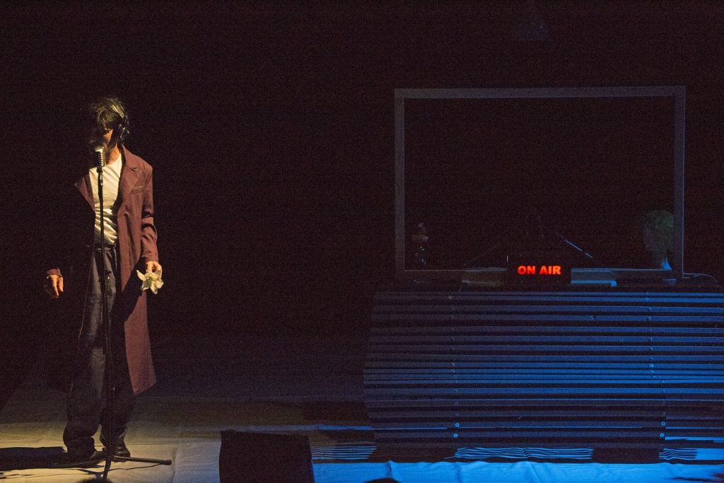 Scéne dominuje rozhlasové štúdio. Hlavný hrdina, Roberto Latini, výstredne oblečený trhan vo fialovom kabáte a s parochňou na hlave, čo mu zakrýva tvár, spí na lavičke. Latini ako rozhlasový moderátor rozpráva do mikrofónu, aby šíril svoje slová v éteri (on air, ako pripomína aj svetelný nápis) a jeho reč sa strieda s hudbou. Okrem toho hovorí s niekým na druhom konci linky, ktorý mu zaťato neodpovedá. Éterom lietajú nádherné slová, plné vôní a chutí, ktoré sa materializujú v človeku, vo svete, kde prostredníctvom hlasu podnecujú všetkými zmyslami lásku.