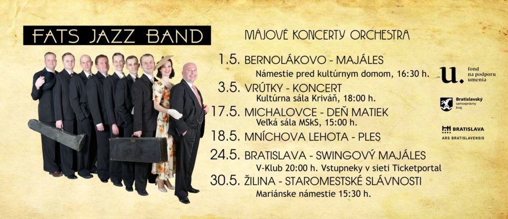 30.05.2019 ŽILINA – STAROMESTSKÉ SLÁVNOSTI Miesto: Mariánske námestie Začiatok: 15:30 hod. Vstup voľný V rámci Staromestských slávností na Mariánskom námestí v Žiline odohrá koncert aj slovenský swingový orchester FATS JAZZ BAND. Swingová hudba 30. a 40. rokov minulého storočia v podaní najúspešnejšej slovenskej swingovej kapely posledných rokov. Atmosféru noblesnej doby prvej polovice minulého storočia, epochu elegantných gentlemanov a pôvabných dám v róbach vytvorí počas koncertu 9-členný swingový orchester Fats Jazz Band.