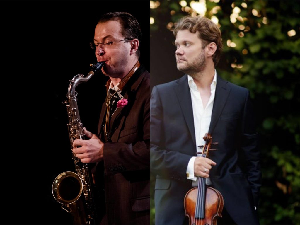 Crossover vyvrcholí dialógom barytón saxofónu a päťstrunových huslí