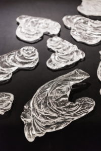 Patrícia sama definuje: „Sklo, či už priehľadnosťou, tvárnosťou alebo optickými vlastnosťami je podobné vode a zároveň odlišné svojim skupenstvom, svojou konečnou podobou a svojim opracovaním. Moja inšpirácia pochádza z môjho pobytu v Nórsku, z rozľahlých jazier a fjordov, daždivých dní v Bergene a z prechádzok pri pobreží. Hlavným cieľom prác bolo zachytenie pohybu vody. Pri vertikálnom pohybe som túto vlastnosť znázornila pomocou farby, ktorá pretekala tabuľou skla. Vďaka technike Pâte de verre, ktorou boli tieto objekty vytvorené, sú schopné nasiaknuť vodu medzi sklenenú fritu. Podobne ako nám chystá život úskalia, dala som do smeru tečenia prekážky v tvare jednoduchých línií, ktoré musí farba obtekať. Vznikol tak kontrast medzi farbou a čírym sklom, ale aj jemný prechod vďaka rozpíjaniu farby. Druhým princípom šírenia sa vody je horizontálny pohyb. Kombináciou rôznych techník odlievania som pomocou hutného skla vytvorila sklenené vlny. Vzniknutá inštalácia toku vody vytvára na jednej jej strane líniu, z ktorej vizuálne vyteká sklo. Zachytila som tak kvapalnosť vody pomocou tekutosti skla. Všetky tieto práce boli vytvorené v S12 Open Access Studio and Gallery v nórskom Bergene, počas mojej pracovnej stáže.“