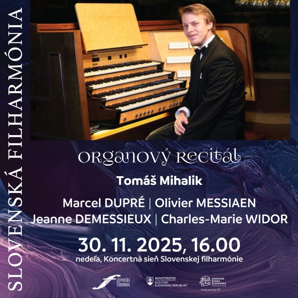 Kráľovský nástroj sa túto koncertnú sezónu rozozvučí trikrát. Filharmonický debut prinesie vystúpenie Tomáša Mihalika, doktoranda VŠMU v triede Imricha Szabóa, ktorý má za sebou aj štúdia v Lyone. V súčasnosti je mladý umelec doma na východnom Slovensku, kde obohacuje kultúrne dianie a vyučuje na Konzervatóriu Petra Dvorského v Košiciach. Úvodný Organový koncert zaznie v nedeľu 30. novembra 2025 o 16.00.