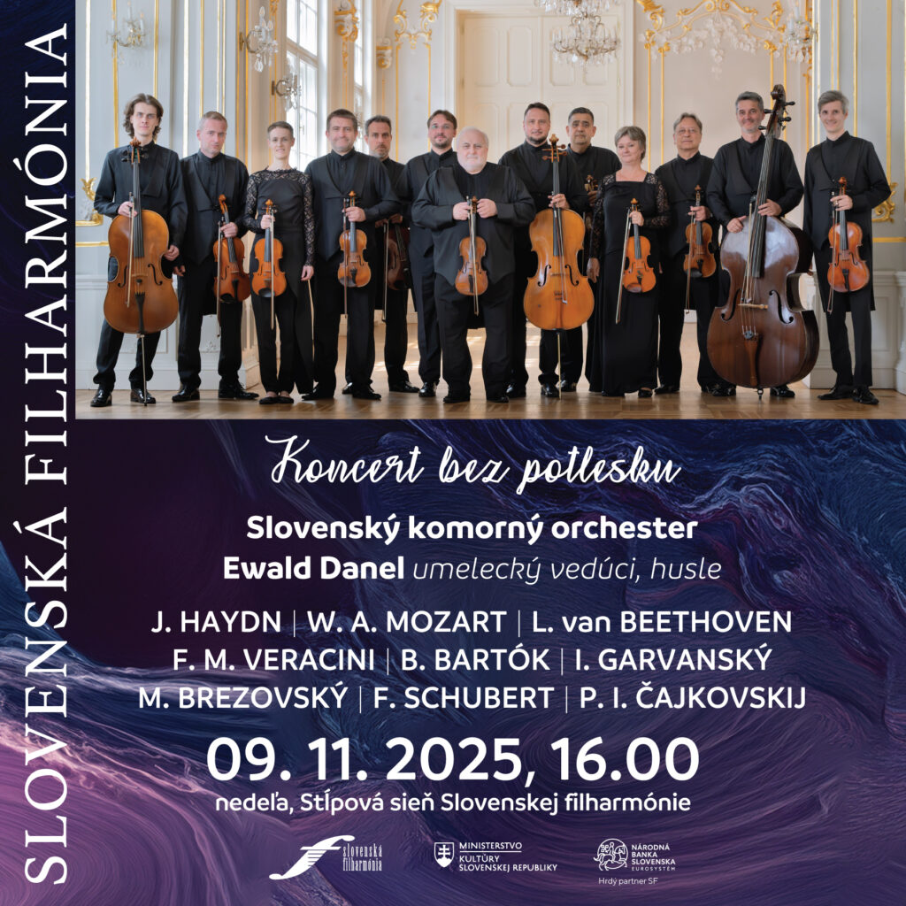 Nasledovať bude Koncert bez potlesku Slovenského komorného orchestra. „Naše životy sprevádzajú chvíle, keď nemáme dôvod na radosť, oslavu či potlesk. V hudbe je veľa kompozícií, ktoré sú pre tieto situácie vhodným sprievodcom. Tak sa zrodila myšlienka koncertu bez potlesku,“ prezrádza umelecký vedúci Slovenského komorného orchestra Ewald Danel. Už niekoľko sezón si kladie za úlohu prinášať poslucháčom menej tradičné programy, medzi ktoré patrí aj tento. Dramaturgia poskytne priestor na meditáciu, stíšenie i uvoľnenie duševného napätia z rýchleho kolobehu bežného pracovného života. Na koncerte zaznejú diela viacerých skladateľov od klasicizmu až po súčasnosť. Nebude chýbať dielo Igora Garvanského, nádejného skladateľa, ktorý za záhadných okolností zahynul vo svojich pätnástich rokoch počas študijného pobytu v Rakúsku. Koncert BEZ POTLESKU je na programe v nedeľu 9. októbra 2025 o 16.00 v Stĺpovej sieni SF.