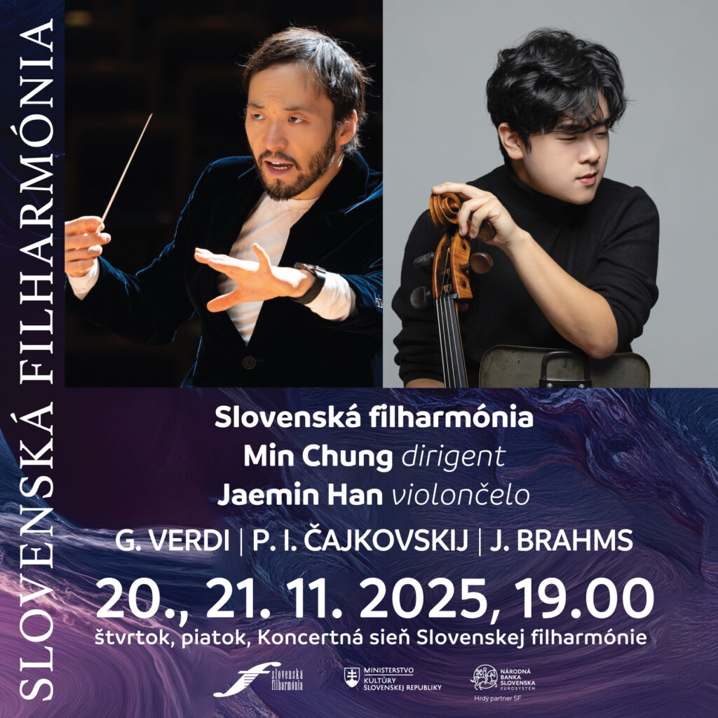 Symfonická dvojica koncertov je na programe vo štvrtok a piatok 20. a 21. novembra 2025 o 19.00. Po boku orchestra Slovenská filharmónia sa debutovo predstavia dvaja kórejskí umelci, dirigent Min Chung, ktorý má na svojom konte úspešné spolupráce s opernými domami ako Teatro alla Scala, kórejská národná opera či Teatro Politeama Greco v Lecce a violončelista Jaemin Han, ktorý sa nedávno predstavil po boku Českej filharmónie v Prahe a na ázijskom turné orchestra. Dvadsaťročný mimoriadne talentovaný kórejský umelec Jeamin Han je víťazom Grand Prix na súťaži George Enescu International Competition.