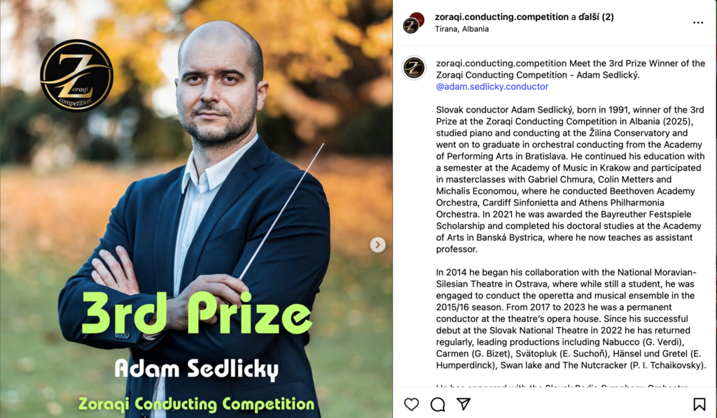 Slovenský dirigent Adam Sedlický sa zúčastnil na druhom ročníku súťaže Zoraqi Conducting Competition, na ktorej získal tretie miesto. Podľa jeho slov sú dirigentské súťaže veľmi špecifické. „Každý účastník má len niekoľko minút na to, aby presvedčil porotu svojím prístupom. Záleží len na dirigentovi, ako s týmto krátkym časom naloží, či sa bude viac zameriavať na prácu s orchestrom alebo na samotné dirigovanie. Získanie 3. ceny na súťaži v Tirane pre mňa znamená naozaj veľa. Je to potvrdenie, že cesta, ktorou sa umelecky uberám, má zmysel,“ hovorí pre náš portál.