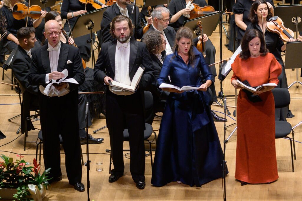 Dirigent dôsledne vystaval tektoniku diela. Od úvodnej úspornejšej inštrumentácie postupne, s precíznosťou staval emocionálnu intenzitu skladby. V niektorých pasážach síce neznel zvuk kompaktne (Und eine Tur ward aufgetan im Himmel) a žiadalo sa s väčšou vycibrenosťou pripraviť dychové nástroje, zato sláčikové priniesli vytúžené „tranquillo“. V ňom nastúpila s tenorom aj nemecká mezzosopranistka Stefanie Irányi mäkkým, spevným, svetlým hlasom a sólový part následne prebrala Simona Houda Šaturová. Slovenská sopranistka mala plnú kontrolu nad hlasom, detailne tvarovala frázy vo výraze „dolce“ vo vysokej polohe. Mužská zostava doplnená Janom Petrykom a Simonom Robinsonom pôsobila vyrovnane a homogénne. Kvarteto sólistov sme s úsporným tichým orchestrom (husle, violončelá) počuli spoločne v časti Heilig, heilig ist Gott der Allmächtige. Intonačne a harmonicky náročný part spevákov preveril, keďže v hudbe mali oporu len v spodnej línii hlasov.