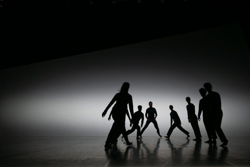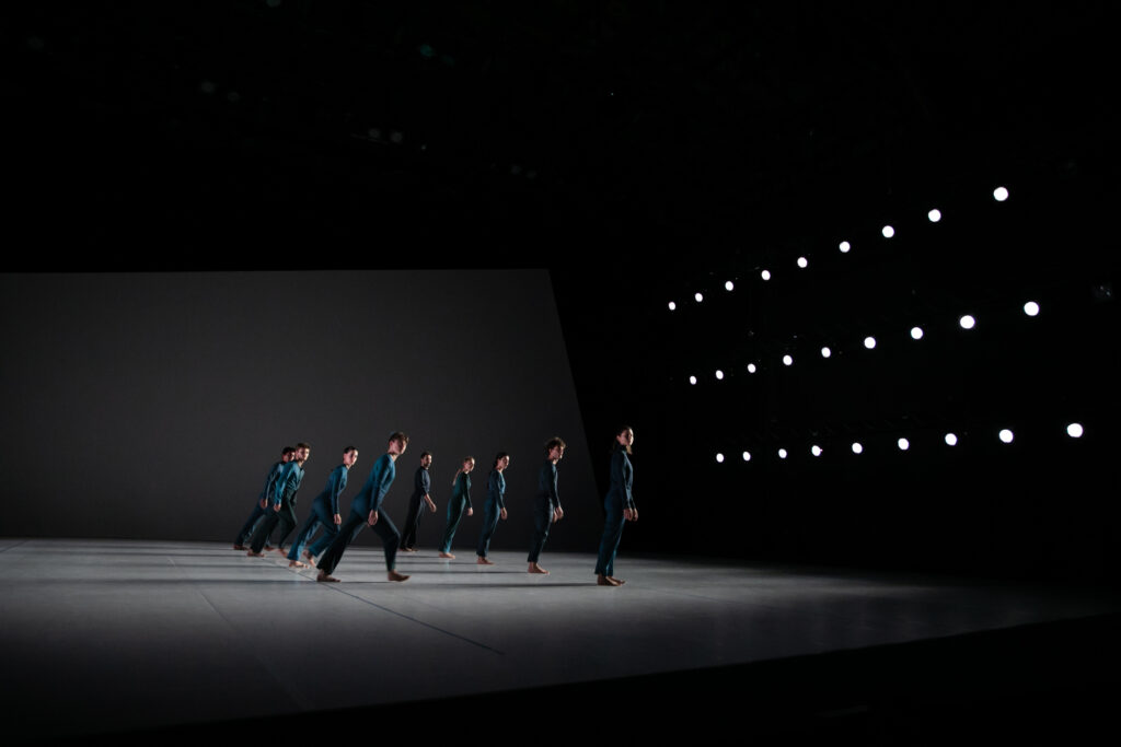 Choreografiu predelí približne v polovici ticho a ustrnutý rad tanečníkov, ktorý sa následne ponorí do esteticky nasvietej scény - svetlo ju len po obvode rámuje, zatiaľ na zadnom horizonte sa takmer v diagonále objaví široký pruh svetla. Centrum javiska je však v tme, tanečníci strácajú svoju identitu, hemžia sa po javisku ako nočné motýle. Rytmus svetla a hudby ich napokon opäť objaví, v temperamentnej dynamike sa v spleti rúk a lete tiel náhle ocitajú v rotačnom pohybe odstredivej sily ako na detskom kolotoči, aby sa v závere sústredili do rohu javiska, znova v rade a chrbtom k auditóriu. Akoby vibrujúca entita odrazu stratila svoju energiu a uchýlila sa k spánku, sústredila sa do ticha a ústrania.
