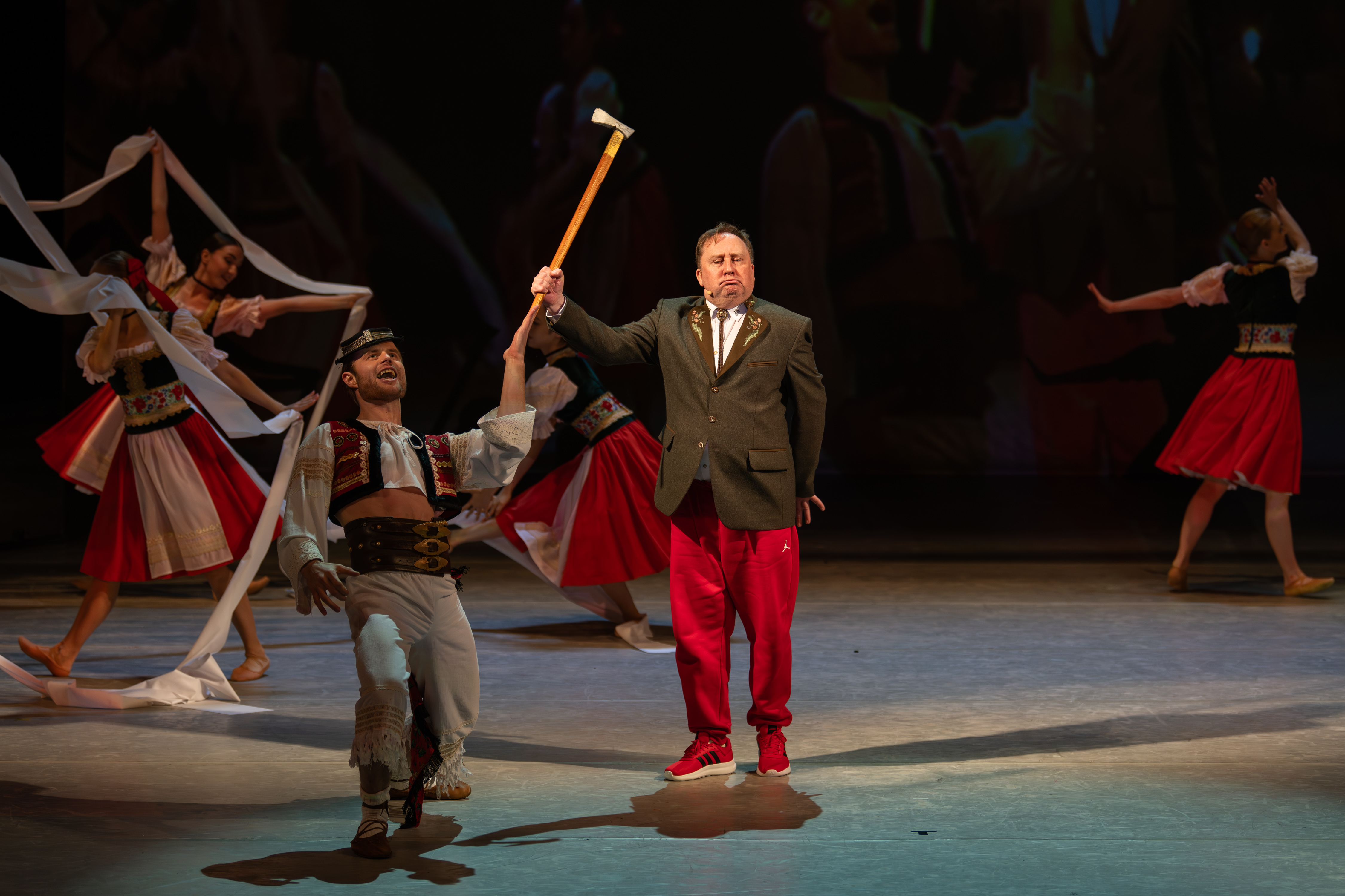 Dôležitú úlohu tu má práve činoherná zložka. Herecké postavy z prostredia divadla – režisér, dramaturgička, riaditeľ baletu, choreograf či inšpicientka – dodávajú inscenácii civilný rámec a jemnú satiru. Mladého režiséra „z Prahy“ vynikajúco predstavil Jakub Kuka. Jeho komunikácia v češtine bola tak prirodzená, že by sme mohli pochybovať, či naozaj nepochádza „z Prahy“. Elena Podzámska stvárnila „pokrokovú dramaturgičku prichádzajúcu z Holandska“. Nič „klasické“ ju zjavne neoslovuje, zatiaľ čo inklinuje k alternatívnym, až synkretistickým riešeniam, ktoré ju jediné nadchnú. Práve v jej postave môže ísť o jemnú satiru, že NDKE nezískalo tento rok žiadnu cenu Dosky 2025, hoci viaceré inscenácie v Košiciach mali čo ponúknuť divákom a boli aj vysoko kriticky ohodnotené. Vtipné poznámky na súčasnú situáciu v kultúre aj spoločnosti Stanislava Pitoňáka ako riaditeľa baletu pobavili mnohých divákov. „Uleteného“ choreografa stvárnil Dalibor Fabian a „nudného“ klasického baletného majstra Sergij Iegorov, inšpicientku Henrieta Kecerová. Ako sama hovorí: „Bolo zaujímavé vymeniť si rolu s kamarátkou, keďže jedna z jej dobrých priateliek pracuje ako inšpicientka v divadle.“ Novou postavou oproti inscenácii z roku 2014 je asistentka dramaturgičky v stvárnení Natálie Častkovej.