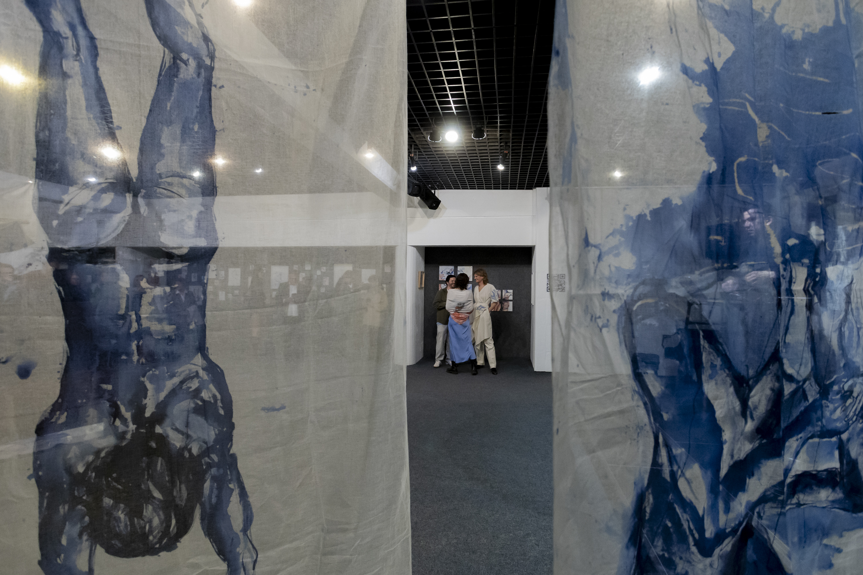 Súčasťou autorskej inštalácie je aj maľba na textíliu, ktorá sa ako baroková drapéria chveje v priestore galérie, zahaľuje a odkrýva v záhyboch dynamickej látky tušenú krásu oddychujúceho a snívajúceho tela. V priestorovej inštalácii zvlnenej steny so silnou expresivitou vystupujú torzá ľudského tela do priestoru akoby sa nás chceli dotknúť, čím pozývajú návštevníkov výstavy k nonverbálnej komunikácii. Výstava svojou krehkosťou, upokojujúcou náladou akvamaríny zasahuje empatického vnímateľa ako Filoktétov šíp, ktorý premieňa jed Hydry na liek komunikujúc tým dvojznačný význam gréckeho pojmu pharmakon. Veď autorka sa vo svojej tvorbe nevyhýba ani témam deprivácie, samoty, násilia, zranení a bolesti. Pod duchnou sa príbehy zvnútorňujú, kde spánok pôsobí liečivou mocou a svetlo rána prichádza až keď je najväčšia tma. Téma zakrývania, zahaľovania, schúlenia rytmizovaná striedaním odkrývania, odhaľovania, zraniteľnej intimity a dôvernosti dáva expozícii expresívne dynamický rozmer prelínania telesného vzopätia (beh a plávanie ako kľúčové tenzie) a následného upokojenia, telesnej úľavy a spočinutia.