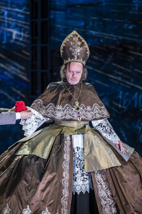 Nepochybne je evidentné, že celá inscenácia viac menej stojí a padá na hlavnom protagonistovi Ľubošovi Kostelnom (Galileo Galilei), ktorý takmer neopustí javisko a vo fáze, kedy si aspoň na chvíľu „len tak posedí“, nám vlastne začne chýbať. Áno, je to práve v momente, keď z neho cirkevní hodnostári urobia doslova šaša s červeným nosom. A nie, nejde tu o karneval, ide o poníženie zastrašovaním. Kostelný svojou autentickou živelnosťou a nasadením obsiahne celé javisko aj inscenáciu, excelentným herectvom, ergo svojim talentom prevalcuje istú časť svojich kolegov, nie preto, žeby to robil zámerne, ale preto, že je to absolútny profesionál. Nielen naštudoval enormné penzum textu, ale ho dokázal preniesť na javisko tak, aby udržal pozornosť diváka, ba viac, svojou osobnosťou si ho jednoznačne získal. Optimistickým opakovaným prekvapením je Juraj Loj (Andrea Sarti), ktorý má za sebou v tejto sezóne bravúrny výkon v postave autistu Adama (Peter Mazalán, Etudy). Aj tu dokázal stvárniť celkom prirodzene vývoj desaťročného chalana až po dospelého jedinca (Andrea Sarti, syn Galileovej gazdinej). Je spontánny, dychtivý po vynálezoch Galilea, ale predovšetkým mu postavu kompletne uveríme. Akoby sa od postavy spomínaného Adama herecky odrazil a konečne naplno uvoľnil svoj potenciál. Gabriela Dzuríková vtrhne na scénu ako pani Sartiová (Galileova gazdiná a Andreova matka), ako vždy extrovertne a živeľne (divácka reakcia potvrdí, že si nechtiac vlečie za sebou svoju Hanúskovú zo seriálového Sľubu, ktorej sa iste potrebuje na javisku striasť). Dzuríkovú vnímam predovšetkým ako divadelnú herečku, ktorá napokon spravidla urobí veľké (v zmysle hlučné) „divadlo“. Pani Sartiová má v jej prevedení však niekoľko polôh, od tej ľahko (a celkom sympaticky) komediálnej, až po tú herecky uváženú, pokojne prežitú a zrelú. Je príjemné, že opustila svoje časté karikovanie postavy a že výnimočne na nás kontinuálne nekričí. Anežka Petrová (Virginia, Galileova dcéra) dôstojne zastúpi postavu rozvernej, trochu jednoduchej dievčiny prahnúcej po sobáši až po zlomenú, sklamanú a oddanú dcéru svojho otca, ktorý jej „svojou vedou“ zničil šťastie. A potom sú tu dva herecké kalibre Robert Roth (Dóža, Matematik, Veľmi starý kardinál v Collegium Romanum, Kardinál Barberini – neskôr Pápež Urban VIII, Pohraničník) a Alexander Bárta (Radný, Filozof, Mních, Astronóm v Collegium Romanum, Kardinál Bellarmin, Pisár), ktorí si tak trochu kontrujú a ťažko zadefinovať, ktorú z postáv zahrali lepšie. Zahrali totiž kvalitne všetky. Každej vdýchli vlastný život tak, aby sa nemali šancu na seba podobať. A táto evidentná diferenciácia navodila dojem spekra charakterov. Ostatne tento počin zmnoženia postáv (ergo jeden herec päť charakterov) opäť „šetrí“ premnožením protagonistov. Hodnotiť profesionálov typu Roth, prípadne Bárta, mi príde občasne až trápne. Disponujú talentom a disciplínou, na ktorú sa dá skrátka spoľahnúť. Ale nedá mi neformulovať ich pod kožu lezúcu, noblesne zahranú zákernosť „dôstojných“ kreatúr s esenciou ľstivej manipulácie a odporného alibizmu so štipkou teatrálneho humoru. Kamila Heribanová (Staršia dvorná dáma, Žena, Spevákova žena, Indivíduum, Prvý chlapec) si našla korektné miesto v súbore, (spomínala som to už v predchádzajúcej recenzii na incenáciu Watsonovci), tu v rámci svojich limitovaných postáv mala možnosť presadiť svoje herectvo dôraznejšie. Roman Poláčik, Gregor Hološka, Jakub Rybárik a Branislav Bystriansky zastúpili spektrum svojich postáv so cťou, neprekročili výrazne svoje tiene. Poláčik so svojou tradičnou snaživosťou, Bystriansky spravidla tak trochu v ústraní, Hološka s nástojčivou komediálnosťou, ktorú prepožičiava svojim úlisným postavám a napokon Jakub Rybárik, ktorému sa podarilo vniesť kus charakteru do každej z postáv. Najvýraznejšie zarezonoval jeho Kardinál inkvizítor s femínnym pohybovým vybavením, najviac štylizovaný od fragmentálneho stepu, cez improvizované „choreografie“ až po náznak tanca Dervishov. Z bulletinu akosi „vypadol“ Martin Šalacha, ktorý v postave nenápadného Malého mnícha uplatnil aj na malej ploche svoje vždy prirodzené a kvalitné herectvo.
