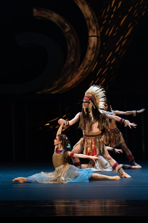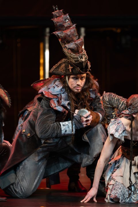 To, čo predsalen robí Petra Pana príťažlivého aj pre dospelého vnímateľa, je skutočnosť kvalitného tancovania sólistov a súboru Baletu SND, ktorí invenčné pohybové skladby choreografa interpretujú prirodzene a profesionálne zároveň. Hneď v prológu je pekný poetický duet a sóla manželov Darlingovcov (Anna Schuster Vágnerová, Andrii Havryliuk) obaja na krátkej ploche predvedú raster elegantných gest v adekvátnej dynamike, tempe aj poézii. Choreografia je postavená na skupinových partoch a tie všetky „skupiny“ zvládli bez výhrad. Trochu svojskej komiky sa príjemne skrýva v jednotlivcoch, čo grupu sympaticky „rozbíja“ a priznáva každému osobitý charakter, pričom tanečne sú kompaktné a jednotné. V Novitzkeho choreografiách je typické (a sympatické) priznanie individuality v „mase“, kde sú všetci tanečne skoordinovaní spolu, ale vždy je tu aj výrazný priestor pre každého jednotlivca. To je ľudské a korektné riešenie, ktoré zároveň necháva divákom možnosť vychutnať si ešte viac jednotlivé pohybové aj výrazové interpretácie. Okrem už spomínaných Darlingovcov, sólistov tu nie je až tak veľa – Peter Pan, víla Cililing, Wendy, kapitán Hook a Tiger Lily. Netreba samozrejme opomenúť tých, ktorí dvom prvým postavám „suplujú“ lietajúce alter egá s akrobatickou odvahou, tanečnou eleganciou a malou výrazovou drámou v slušnej výške na dlhých popruhoch (Filip Manca a Ema Dobešová). Aj pes Nana tú má svoju rozkošnú výrazovú a zábavnú tanečnú plochu úplne skrytý v kostýme-maske (Peter Andel), krokodíl zastrčený v skelete sa pomerne slušne plazí (Andrii Havryliuk) a skvelý je Tieň Petra Pana (Gerardo Gonzales Villaverde), ktorého naháňa. Mimochodom, bolo by korektné minimálne na webovom sídle (keď už informáciu nenájdeme v bulletine, ani v jeho prílohovom letáčiku) uvádzať aj mená tých, ktorí sú skrytí v maskách (okrem psa nenájdeme Tieň, Krokodíla, ani Darlingovcov, ba dokonca ani lietajúceho Petra Pana a Vílu Cililing, ak neberiem do úvahy popisky fotiek).