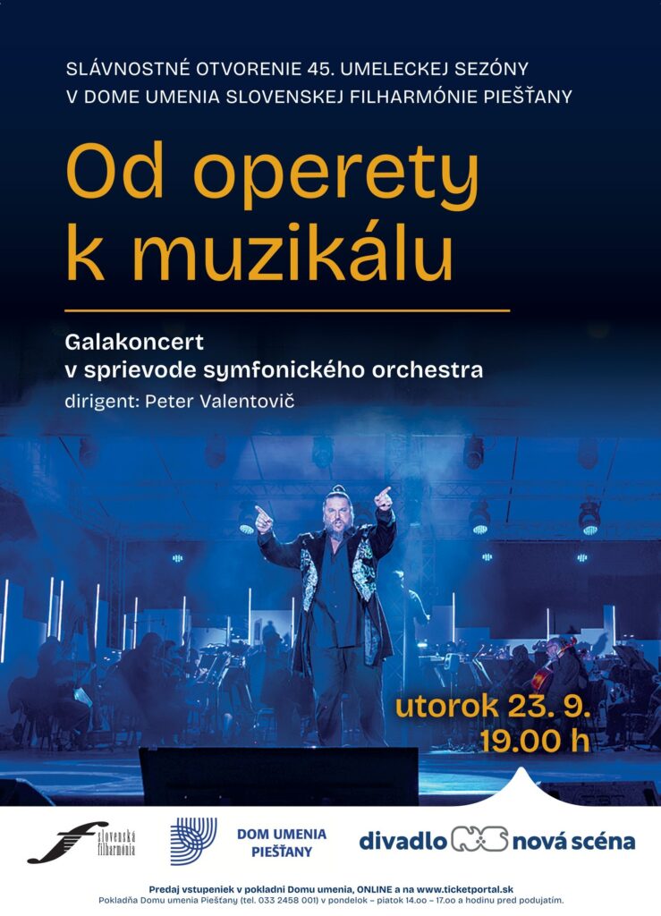 Generálny riaditeľ Slovenskej filharmónie (SF) Marián Turner a riaditeľka Domu umenia SF (DU SF) v Piešťanoch Edita Bjeloševičová pozývajú na slávnostné otvorenie 45. umeleckej sezóny Domu umenia v Piešťanoch. Návštevníci DU SF zažijú neopakovateľný večer galakoncertu OD OPERETY K MUZIKÁLU v spri...