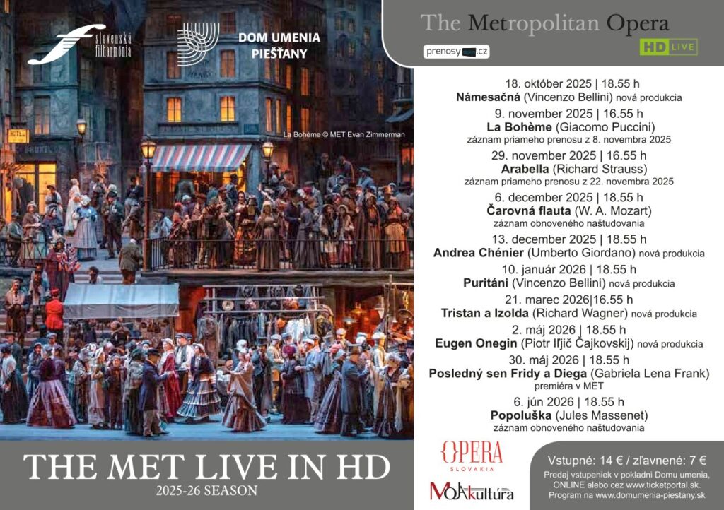 Dom umenia Piešťany aj v novej sezóne prináša divákom jedinečnú možnosť zažiť čaro svetovej opery priamo z legendárnej Metropolitnej opery v New Yorku. Prostredníctvom obľúbených priamych prenosov si môžete vychutnať nové inscenácie, hviezdne obsadenia i nezabudnuteľné hudobné zážitky. Sezóna...
