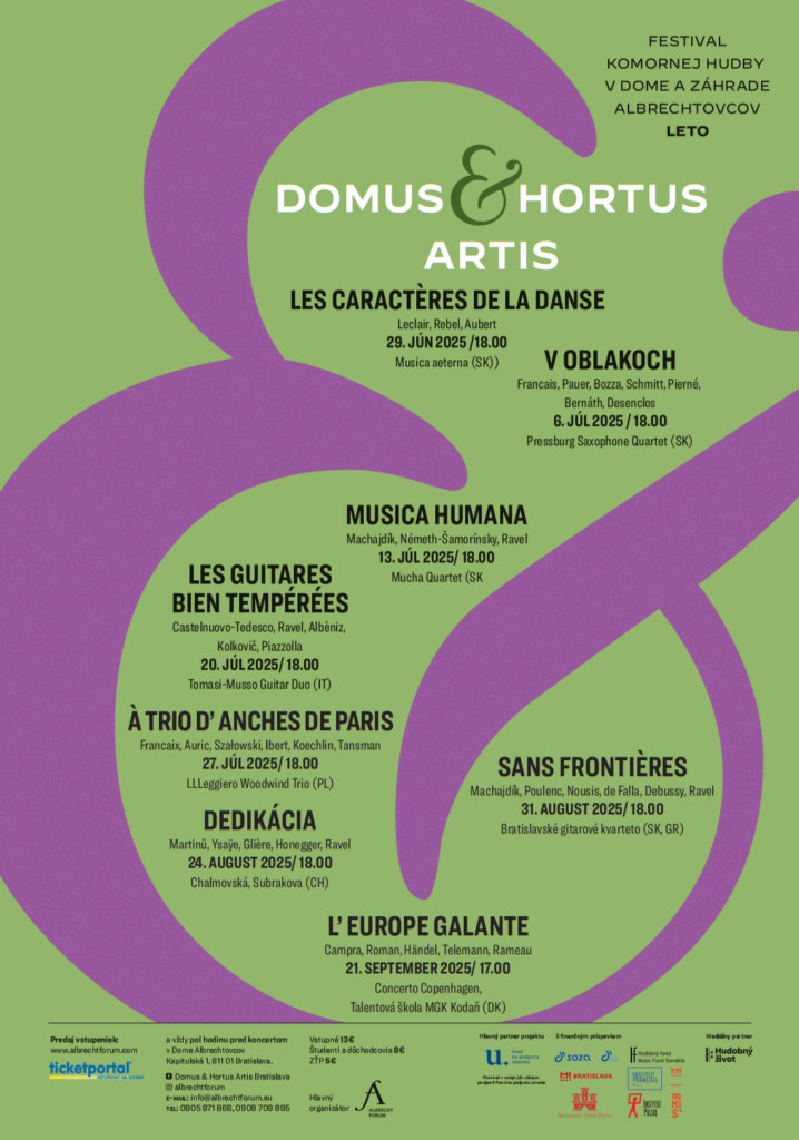Veríme, že priaznivci gitarovej hudby ocenia ďalší koncert Bratislavského gitarového kvarteta 31. 8. 2025, ktoré zahrá nový program s kompozíciami Francisa Poulenca, Manuela de Fallu, Claudea Debussyho a Mauricea Ravela. Zaznie aj nedávno premierovaná skladba Petra Machajdíka Von z temnoty a úplná novinka z pera Yorgosa Nousisa (člena kvarteta) Melodilia. Letnú – záhradnú – časť festivalu Domus & Hortus artis 2025 uzavrie 21. 9. účinkovanie hostí z Dánska. Členovia renomovaného Concerto Copenhagen a Talentovej školy MGK Kodaň zahrajú suity Georga Philippa Telemanna, dve árie Georga Fridricha Händela a Antonia Caldaru a francúzske leto zakončia barokové tance André Campru L´Europe Galante resp. suita z Rameauovej opery Dardanus.