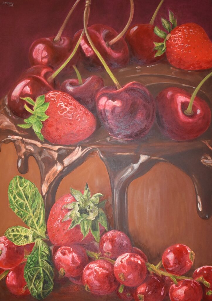 Tieto zmyslové zážitky paradoxne nespôsobuje realistické zobrazenie (hoci tu možno tušiť náklonnosť k tradícii flámskych a holandských autorov a ich zátiší), je to práve forma možno aj trochu drzého, zľahka vulgárneho spôsobu zobrazenia, ktorý mimovoľne evokuje fenomén zmyselnej erotiky, akýchsi labužníckych orgií. Nie sú to len koláče, šľahačky a vlhké rezy jahôd, je tam kdesi podprahovo aj Deväť a pol týždňa (film z roku 1986), a keď to preženiem so súčasným trendom fotenia mobilom takmer každého jedla čo len trochu esteticky nadekorovaného, tak aj tento „zvrhlý“ moment tam možno nájdeme.