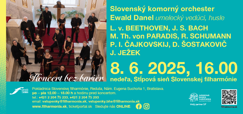 V nedeľu 8. júna 2025 o 16.00 sa v Stĺpovej sieni Slovenskej filharmónie uskutoční koncert Slovenského komorného orchestra pod umeleckým vedením Ewalda Danela. Komorný orchester pokračuje vo svojej dlhoročnej tradícii hudobných stretnutí, ktoré sú prednostne určené zdravotne znevýhodneným návštev...