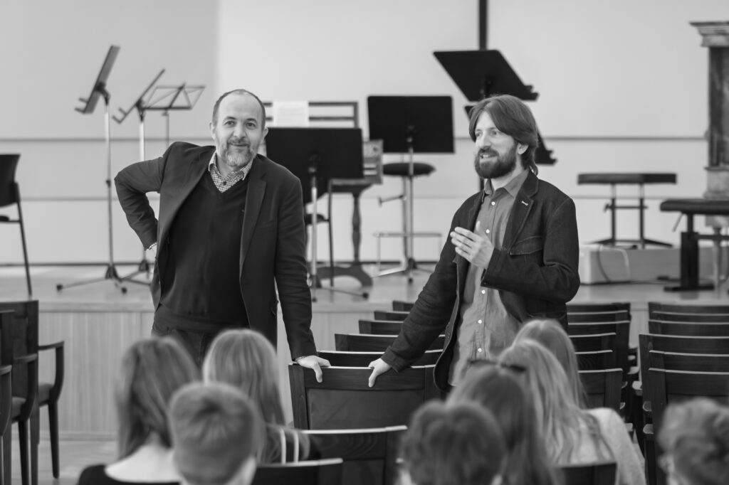 Po skúške pokračovalo stretnutie so šéfdirigentom Danielom Raiskinom a dramaturgom Jurajom Bubnášom. Spoločne diskutovali o hudbe, profesií dirigenta, ale aj o každodennom dianí v Slovenskej filharmónii.
