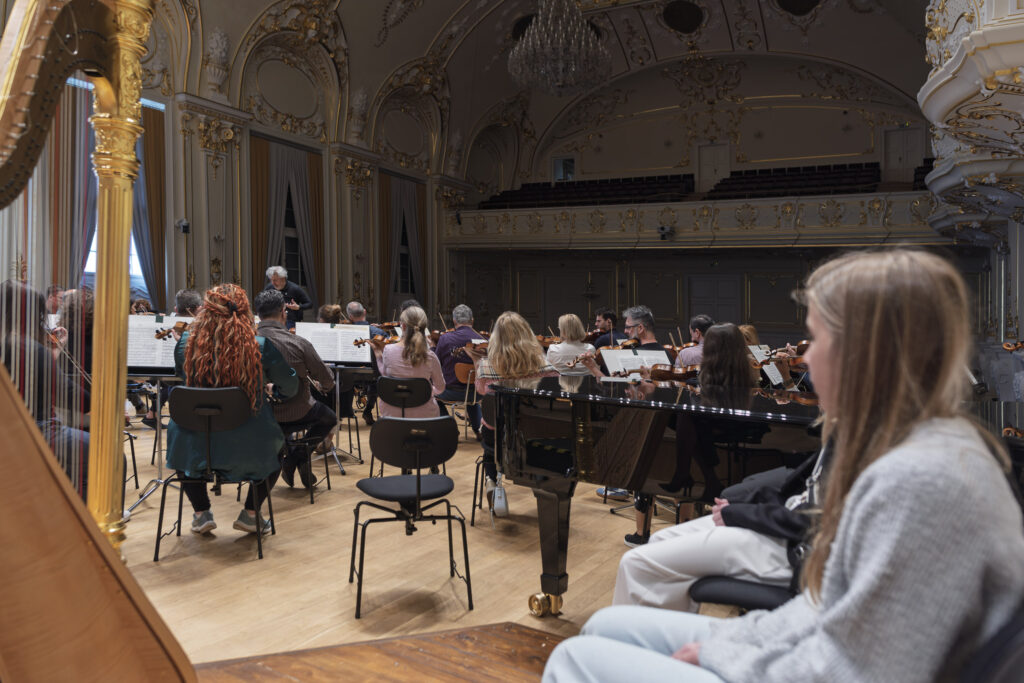 Mladí gymnazisti sa v úvode zoznámili s priestormi Slovenskej filharmónie. Po prehliadke Stĺpovej siene a Malej sály pokračovali do Koncertnej siene SF, kde prebiehala skúška orchestra so šéfdirigentom Danielom Raiskinom na koncerty vo štvrtok a piatok. Šiesti z prihlásených študentov sa posadili priamo k jednotlivým hráčom orchestra a stali sa tak súčasťou nášho prvého symfonického telesa.