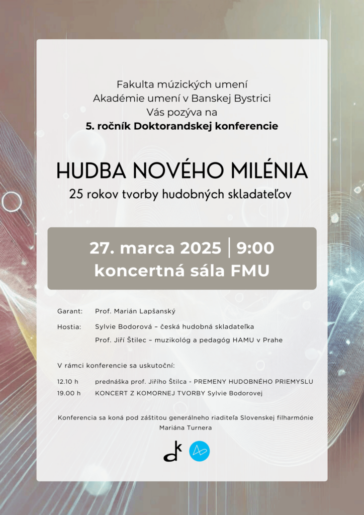 Fakulta múzických umení Akadémie umení v Banskej Bystrici pozýva na 5. ročník Doktorandskej konferencie s témou Hudba nového milénia, 25 rokov tvorby hudobných skladateľov, ktorá sa bude konať vo štvrtok 27. marca 2025 od 9.00 v koncertnej sále Fakulty múzických umení. Garantom výnimočného poduja...