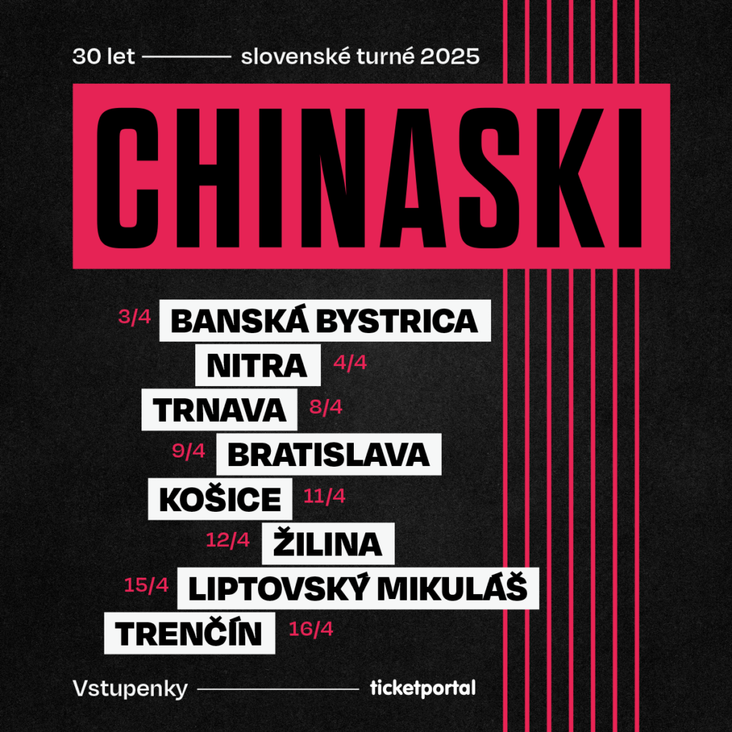 Narodeninový album 30, z ktorého novinka Slyším tvoje kroky pochádza, obsahuje desať piesní z 30-ročnej histórie CHINASKI. Okrem známych hitov ho doplnili troma novými piesňami. Výročný nosič je dostupný v troch formátoch, a to na CD, vinylovej LP a v špeciálnej limitovanej edícii LP s číslovanými a podpísanými autorskými plagátmi, ktoré navrhoval Michal Malátný. Piesne z novinky predstaví kapela v zložení Michal Malátný, Franta Táborský, Tomi Okres, Lukáš Pavlík a Honza Steinsdörfer na slovenskom turné. Nenechajte si ujsť CHINASKI – 30 let – slovenské turné 2025, ktoré vypukne od 3. do 16. apríla v mestách Banská Bystrica, Nitra, Trnava, Bratislava, Košice, Žilina, Liptovský Mikuláš a Trenčín. Vstupenky si môžete kúpiť tu.