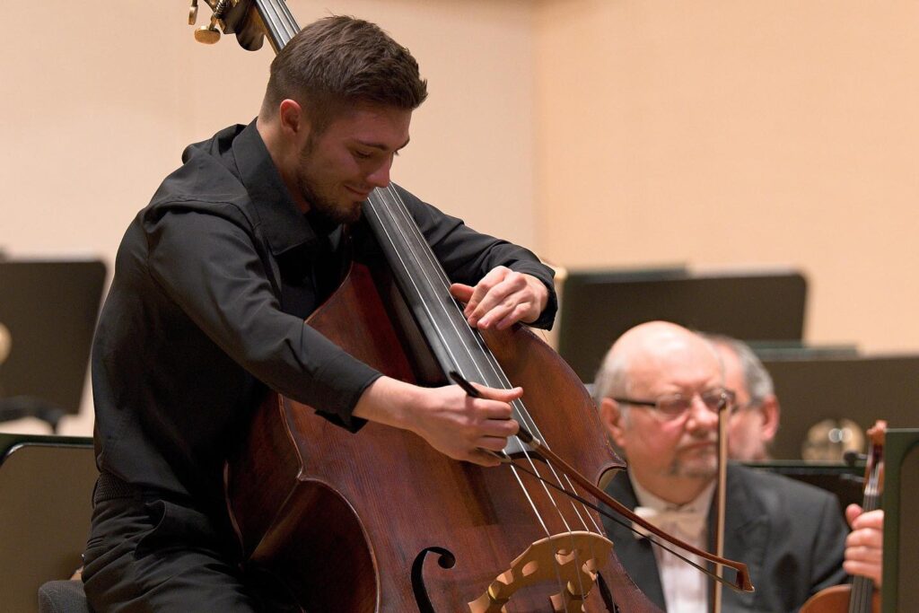 Ďalším sólistom piatkového večera je kontrabasista Cristian Rotaru, študent z Moldavska, ktorý stredné hudobné vzdelanie získal v Kišiňove a vo vyššom pokračuje na Slovensku u pedagóga zvučného mena – Jána Krigovského. Predstavil sa v slávnom Bottesiniho Koncerte pre kontrabas a orchester č. 1 fis mol, ktorý patrí k najnáročnejším koncertom napísaným pre tento nástroj. Dielo plné virtuozity a zároveň emocionality, je pre hudobníkov výzvou. Práve technická dokonalosť často víťazí nad hĺbkou emócií, čo je však škoda, pretože sa tým popiera jeho vnútorná dráma a spevnosť. To však nebol prípad Cristiana, ktorý je skvelým muzikantom. Na druhej strane, nedostatočné skúsenosti s koncertnou praxou sa podpísali pod jeho interpretačný výkon. Paradoxne, v technicky menej náročných častiach mal problémy s intonačnou istotou, tie náročné boli vycibrené a presné. V prvej časti koncertu mal dostatočne expresívny prejav, v orchestri nezanikol, Olos ho dobre tlmil. Kontrabasistov cit pre stavbu melódie, jej stvárnenie v prekrásnych oblúkoch a jeho natur muzikalita – to všetko v jeho v interpretácii nechýbalo. Práve kontrabas je v prvej časti nositeľom lyrických partov a intimity, z ktorých sa postupne stávajú expresívne výpovede. V ústrednom sólovom výstupe bol sólista presvedčivý a sebaistý – so schopnosťou kresliť potrebnú drámu vo svojom parte. Druhá časť diela, Andante, má pochmúrny, bôľny charakter. V sále sme ho mali aj so sprievodom ostentatívneho vyzváňania mobilného telefónu. Jeho majiteľ ho nechal zvoniť a sálu opustil – intenzita zvučky prekrývala zvuk orchestra. Kým teda poslucháči vysokých umeleckých škôl preukázali absolútnu disciplínu, publikum totálny chaos a nedisciplínu. Každopádne, v pomalej časti sa rozhodne žiadal podstatne expresívnejší prejav, interpret akoby strácal pevnú pôdu pod nohami, pritom potenciál má z muzikálneho hľadiska obrovský. V jeho hre sa odrážal vnútorný diskomfort, no z niektorých miest ste priam cítili, ako ich prežíva a rozumie emocionalite tohto diela. Aj vo finále to bolo rovnaké – výborná príprava, no perfektný virtuózny výkon ostal v skúšobnej miestnosti školy. Cristianovi však prajeme len úspechy, dostatok sebavedomia na verejných vystúpeniach a ďalšie rozvíjanie muzikality, ktorej dostal do vienka dostatok.