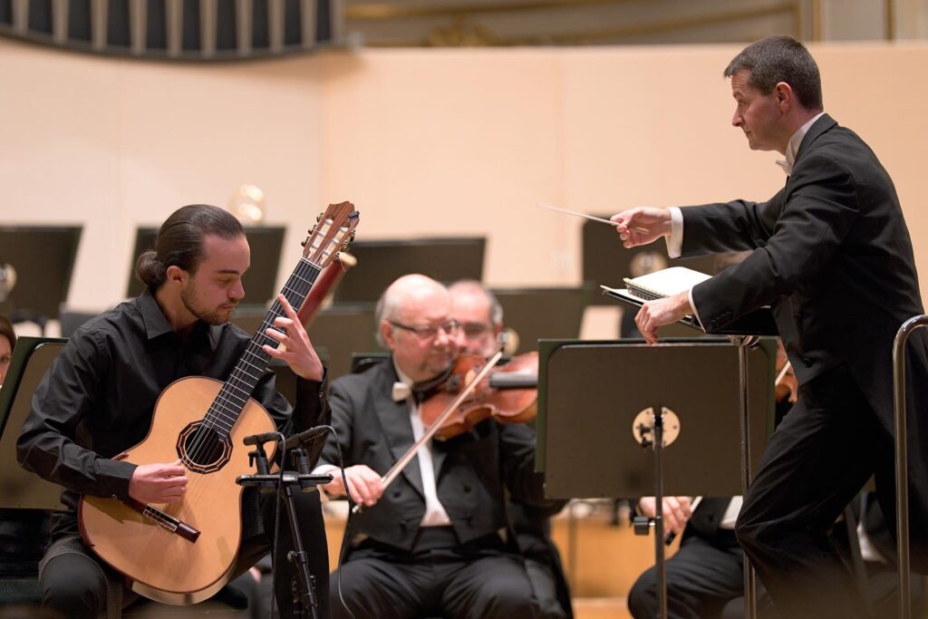 Druhým sólistom večera bol gitarista Filip Babić, ktorý pravidelne vystupuje ako sólista a člen komorných zoskupení. Štúdium hry na klasickej gitare ukončil na Vysokej škole múzických umení v Bratislave pod vedením Mgr. art. Karola Samuelčíka, ArtD v roku 2024. V štúdiu pokračoval na viedenskej Universität für Musik und darstellende Kunst a na Hudobnej akadémii v Krakove. V súčasnosti pokračuje v štúdiu manažmentu umenia a kultúry na Sibeliovej akadémii v Helsinkách. V jeho interpretácii sme počuli Concierto del Sur pre gitaru a orchester mexického skladateľa Manuela Mariu Ponce. Babić zúročil svoje pódiové skúsenosti – veľmi dobre s orchestrom spolupracoval, v prvej časti sme boli svedkami dialogických partov, v ktorých dokázal zvukovo vyniknúť. A hoci je gitara považovaná za tichší nástroj, jej zvuk sme počuli v sále vďaka nazvučeniu dostatočne a v homogénnom zvuku s orchestrom. Farby orchestra spolu s partom gitary v neskororomantickom móde, s modernými prvkami impresionizmu a neoklasickej hudby kombinovanej s hispánskou ľudovou kultúrou dávali tomuto dielu exotický charakter. Počuť ho bolo napríklad aj v úvode kadencie v prvej časti koncertu. Babić ju vystaval bravúrne – z dynamickej stránky, taktiež tektonickej. Po uvedení motívov ich nechal doznieť, čím frázy získali na plastickosti a kadencia na voľnosti a dôveryhodnosti. V intímnych partoch kadencie krásne vyzneli jeho flažolety, no i virtuózne úseky zvládol presvedčivo a s dostatočnou dávkou muzikality, nebol to len technicky vydretý part, ale hudba vo svojej plnej kráse. S údivom som sledovala burácajúci potlesk v sále po prvej časti – pri koncerte poslucháčov umeleckých škôl som tak trochu očakávala, že aj publikum bude patrične vzdelané. Zjavne sa na koncerte zišla v sále všehochuť.