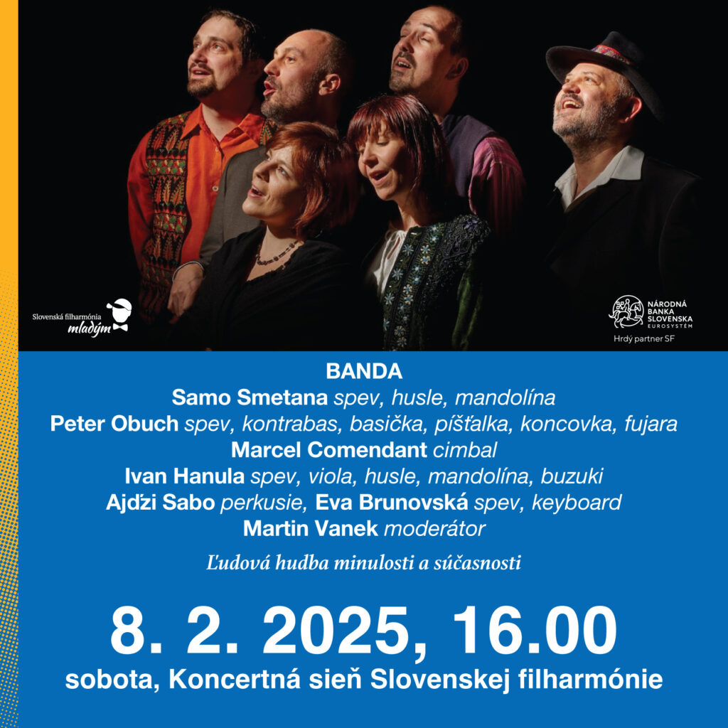 Členovia medzinárodne uznávanej world music kapely BANDA, Samo Smetana, Peter Obuch, Marcel Comendant, Ivan Hanula, Ajdži Sabo a Eva Brunovská, odborníci na ľudovú hudbu, vám ju na koncertoch predstavia do detailov. Predvedú, čo všetko sa dá s touto krásnou hudobnou tradíciou urobiť, ako sa dá tvorivo a zábavne spojiť ľudovú hudbu so súčasnými žánrami. Predstavia deťom sólové pastierske dychové nástroje - koncovku, 6 dierkovú píšťalku a náš svetový unikát fujaru, bicie nástroje a odkiaľ sa k nám dostali. Deti sa dozvedia, kto je v kapele primáš, kontráš, basista či cimbalista, ako sa hrávalo v rôznych regiónoch Slovenska. Rodinný koncert s kapelou BANDA sa v bratislavskej Redute začne v sobotu o 16-tej. Hudobným popoludním bude deti sprevádzať Martin Vanek. Nebude chýbať tombola a malé prekvapenie pre všetky deti.