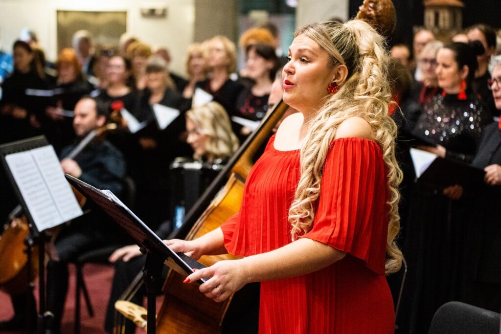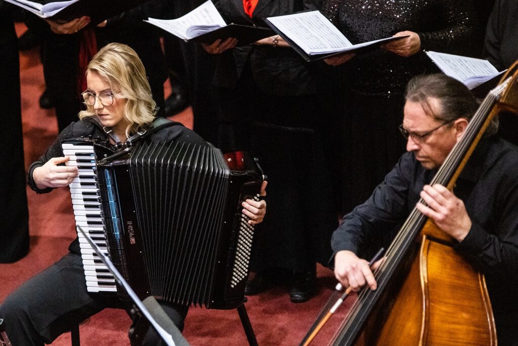 Palmeri a jeho Misa a Buenos Aires sa začala expresívnym, rytmicky presným nástupom – Lukáš Kunst viedol oba zbory energickým a presným gestom. Je zjavné, že v oboch zboroch panuje disciplína, napovedali o nej nielen presné nástupy, ale i vyvážená dynamika. Po úvodných dvoch frázach znelo kontrastné pianissimo a krátka medzihra v príťažlivo synkopovanej rytmike – klavír a akordeón. Pestré dielo skladateľa uvádza najprv ženské hlasy (z nich na koncerte sa dala vytknúť jedine prílišná dominancia sopránov) a následne mužské, stabilné intonáciou a dostatočne znelé. Ostrú rytmiku akcentovala Andrea Bálešová na klavíri – jej basová opora spoľahlivo viedla rytmicky skladbu. Lukáš Kunst vyzdvihol krátke melodické motívy, ktoré sa v speve objavili – následne aj v inštrumentálnych partoch. Hneď v Kyrie to bol záverom motív v akordeóne, rozvinutý vo variácii, následne znel aj v sólovom klavíri. Christe eleison prinieslo pokoj vo výraze i dynamike, stíšenie, ktorého gradácia bola predznačená v hustnúcom parte akordeónu – vždy s rytmikou tanga. Pocit slobody a voľnosti tohto tanca bola citeľná najmä v melodike, ale i partoch sláčikového kvarteta. Na jednej strane s priznanou rytmikou, ktorá skladbe dáva nezameniteľný esprit, na druhej život, energia a nespútanosť. Dynamicky i tempovo prekrásne stvárnená časť, končiaca v tichom móde, prešla plynulo do ďalšej – Gloria. Výrazne kontrastný sólový part písaný pre mezzosoprán stvárnila Mária Štúrová bravúrne. Farbou i volumenom má potenciál pre mladodramatický soprán, je to výrazovo flexibilná speváčka, ktorá za uplynulé obdobie spravila ďalší veľký krok v sólovej kariére. Je frekventantkou Operného štúdia SND, ktorého šéfkou je od novembra 2024 Jolana Fogašová. Naša operná diva je zároveň vokálnym koučom vybraných účastníkov Operného štúdia a hlasovo vedie aj Máriu Štúrovú. V jej podaní sme počuli pekne zaoblený soprán, nad ktorým speváčka nadobudla absolútnu kontrolu. Vie ho dostať do masky, aj v spodných polohách bol objemný, nosný a nechýbala mu potrebná farebnosť. Pomalý part, kontrastný k zborovému úvodu Glorie, vytváral melancholický protipól, skladateľ mu dal duchovnú hĺbku, inštrumentálne ho oprostil a priniesol vážnosť nálady a myšlienok. Qui tollis malo ukážkovo viazané dlhé tóny so vzácnou vyváženosťou zakončení fráz, plnosť a objemnosť tónov v stredných polohách v nádherne uchopenom mezzoforte, bez prekročenia tejto dynamickej hladiny, zároveň s potrebnou voľnosťou vo vnútri – práve tú sme potrebovali cítiť.