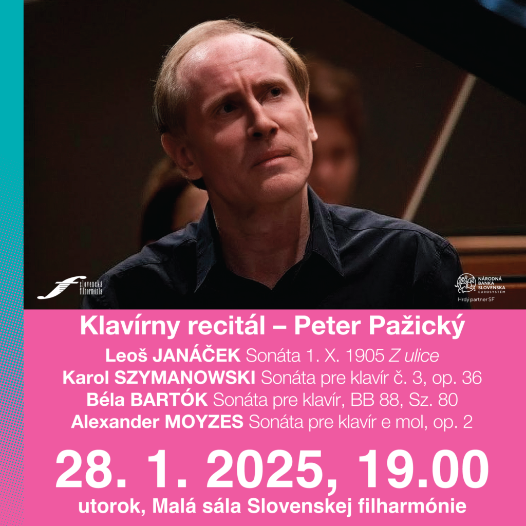 Cyklus Klavír a klaviristi ponúkne v utorok 28. januára koncert slovenského klaviristu Petra Pažického, ktorý svoj program vyskladal zo sonát štyroch skladateľov - Leoša Janáčka Bélu Bartóka, Karola Szymanowského a Alexandra Moyzesa. Koncert sa uskutoční v Malej sále Slovenskej filharmónie o 19....