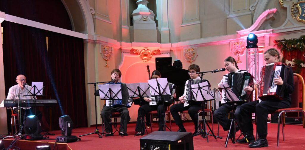 Pätica akordeonistov sa predstavila v Akordeónovom súbore ZUŠ (korepetícia, príprava a úpravy ľudových piesní – Marián Kamenický, DiS. art.). Rusínsku Vianočnú pieseň priniesla v jedinečnej interpretácii pred dvoma rokmi speváčka Janais. Popri všetkých koledách, ktoré dôverne poznáme, sa zrazu objavil závan niečoho nového a originálneho. Rusínska ľudová pieseň je hlboká, vnútorne bohatá, melodicky a výrazovo úplne odlišná od piesní, ktoré spravidla pred Vianočnými sviatkami znejú. Jej clivotu podčiarkol sólový spev, technikou sledujúc vokálny prejav ľudových piesní, tercovanie druhého jej dodalo novú farebnosť. Ďalšia ľudovka - Keby ja mal, bola charakterom kontrastná, v rýchlom tempe, veselá.