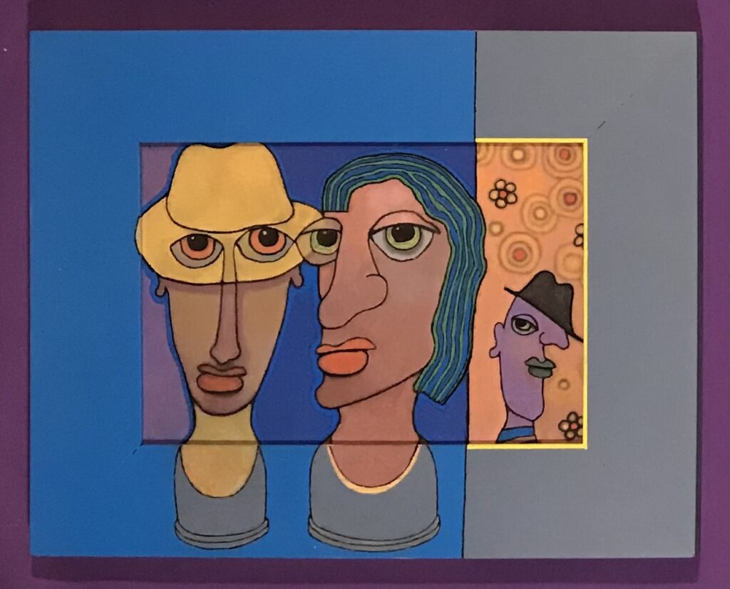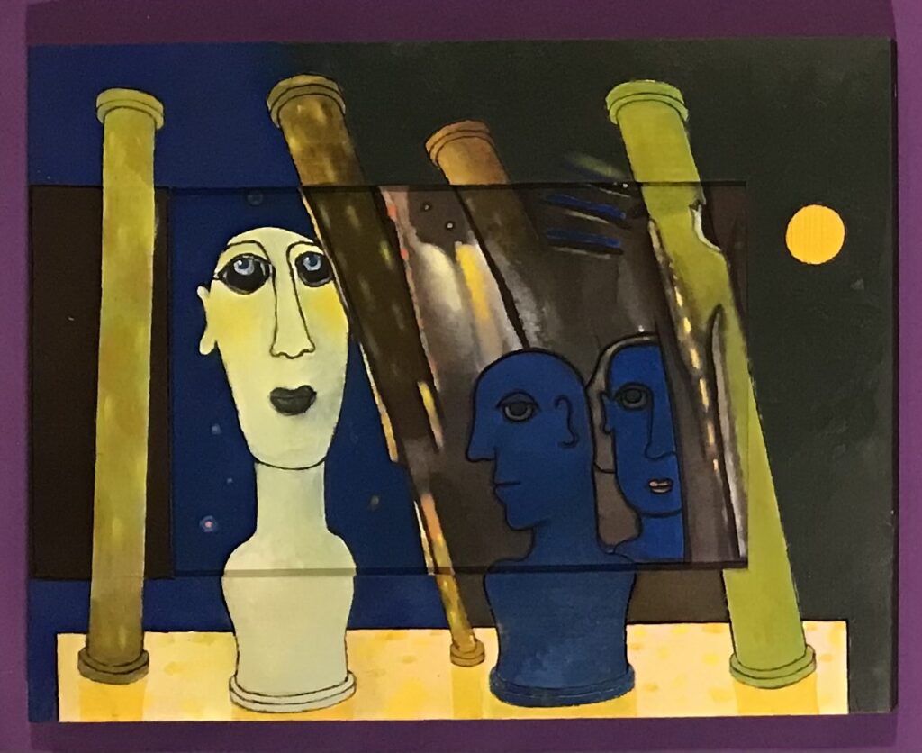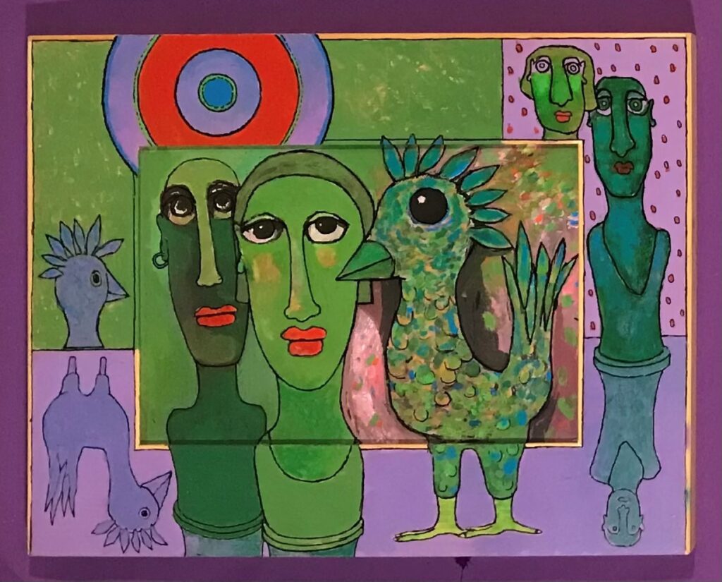 Výtvarník situuje do centra štylizovanú ľudskú figúru (často sporo odetú) iba s určujúcimi atribútmi – korálky, náušnice, kabelky, čiapky, klobúky. Do plošného prostredia, či pozadia, ktoré kompozične geometricky člení, osadzuje drobné prvky – osamotené tulipány, poháre, fľaše, drobnú siluetu bratislavského hradu, alebo plochu pokrýva pierkami, bublinkami, krúžkami, vtákmi, lietadlami, ktorých zmnožením dosahuje čiastočnú dekoratívnosť zobrazeného. Linka je vždy jednoduchá, súvislá, ba dokonca sa cielene stráca, dôraz je kladený na sýty kolor , ktorý dáva do kontrastu zdanlivo nezlučiteľných kombinácií. Do obrazov začleňuje zoomorfné prvky, ktoré s absolútnou samozrejmosťou spolužijú s ľudskými figúrami – prevažne je to pes, ale predovšetkým vták, ako reprezentant slobody, milý operenec, alebo vo svojej strnulej statickej topornosti symbolicky zadefinovaný adept mužského pokolenia. Výjav sa často derie z plochy von, prekračuje zadefinované limity, roztopašne „tečie“ cez rám obrazu.