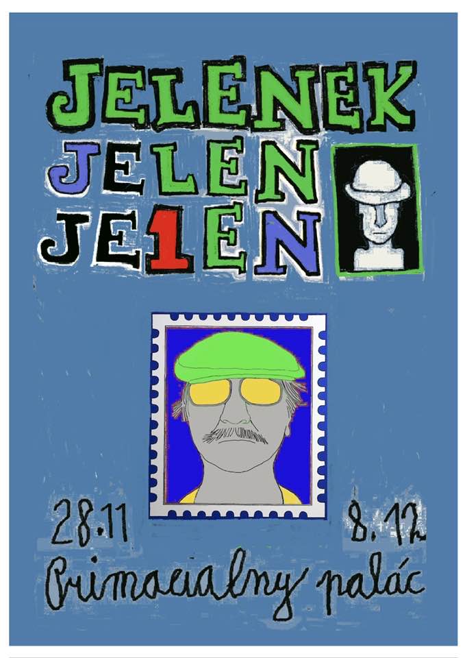 Jaroslav Jelenek sa narodil 14.7. 1946 v Bratislave. Študoval na Slovenskej vysokej škole technickej v Bratislave. Vo svojej tvorbe sa venuje prevažne maľbe a kresbe, využíva kombinované techniky, asambláže a dominantou jeho malieb je figúra, zámerne štylizovaná, oprostená od detailov. Zásadným motívom v jeho maliarskej tvorbe je humor, ktorý dosahuje nie len vtipnou deformáciou postáv, ale aj osadením ich do rôznych, viac menej bežných a zároveň bizarných komorných, zväčša plošných, prostredí. Svoj obraz autor dopovedá krátkymi príbehmi, pričom jeho humor je inteligentný, láskavý, jemne ironický a zábavný. Načrtáva ho už v názvoch svojich predchádzajúcich výstav, ktorými boli napr. Člověče, nezlob se , Osamelý krasokorčuliar, Jelene Jelene, oči máš modré , Pocta neznámej spermii rovnako, ako v názvoch diel – Všetky som zviezol, Lízači známok, Zátišie s prezervatívom, Ochlpené štěstí...Dnešná výstava však (z rozhodnutia autora) cielene názov nemá. Výtvarník, akoby si z nás i celého bytia robil žarty, na ktoré sa v princípe nikto nemôže uraziť, hoci (nazerajúc na súčasné dianie v spoločnosti), možno nejaká tá trafená hus zagága.