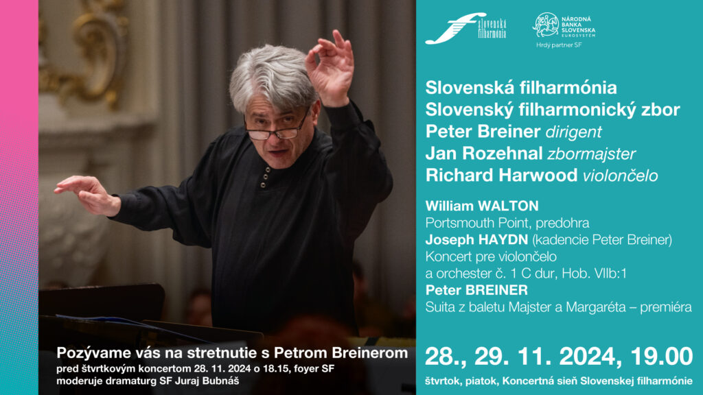 Na úvod koncertov zaznie predohra Portsmouth Point britského skladateľa Williama Waltona, ktorého k skomponovaniu inšpiroval obraz prístavu od Thomasa Rowlanda. Waltonova predohra s prvkami jazzu je hravá a farebná ako výtvarná predloha. V roku 1926 zaznela na prehliadke súčasnej hudby v Zürichu. Hudobný odkaz Josepha Haydna je nesmierne bohatý, na svojom konte má množstvo kompozícii – viac ako sto symfónií, vyše šesťdesiat sláčikových kvartet, komorné diela, opery, omše, oratóriá, koncerty pre sólové nástroje... Koncert pre violončelo a orchester č. 1 C dur patrí medzi najznámejšie dielo koncertantnej literatúry vôbec. Zaznie v originálnej verzii s kadenciami Petra Breinera v interpretácii Richarda Harwooda, ktorý sa v bratislavskej Redute predstavil spolu s Petrom Breinerom v komornom zoskupení NW3Trio na jar 2024. Okrem sólovej dráhy umelec spolupracuje s mnohými orchestrami a pôsobí aj pedagogicky na Royal College of Music v Londýne. V druhej polovici večerov je na programe druhá premiéra slovenského skladateľa v aktuálnej koncertnej sezóne.