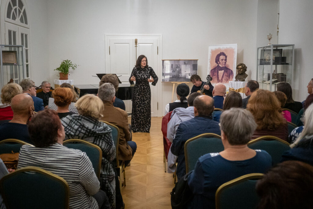 Okrem portrétu Schuberta, ktorý priestor hudobného salóna zdobil, to boli ďalšie predmety pripomínajúce skladateľovo pôsobenie v Želiezovciach aj jeho vrúcny citový vzťah ku Caroline Esterházy. Počúvať v týchto priestoroch piesne, ktoré napísal, bolo doslova magické. Franz Schubert pôsobil v Želiezovciach v rokoch 1818 a 1824 ako domáci učiteľ hudby dcér grófa Jána Karola Esterházyho de Galantha. Schubert patrí medzi najznámejších a najvýraznejších autorov piesní. Zhudobnil v nich romantickú poéziu dokonalým spôsobom – nielen tieto dva svety, literárny a hudobný, prepojil, ale syntézu zavŕšil v podobe praxe na komorných večierkoch zvaných Schubertiade, ktoré boli odrazom doby. Po náročných vojnových časoch ľudia túžili po priateľských stretnutiach, výletoch a večierkoch, nastalo ovzdušie priaznivé pre rozvoj umenia. Rozvíjalo sa domáce muzicírovanie, ktoré sa odrazilo na obľúbenosti sólovej i komornej tvorby, predovšetkým však v piesní v nemeckom jazyku – lieder.