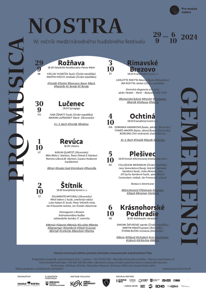 Aj tento rok zavíta obľúbený festival klasickej hudby Pro musica nostra do regiónov Gemera, Novohradu a Malohontu. Obyvatelia a návštevníci Rožňavy, Lučenca, Revúcej, Štítnika, Rimavského Brezova, Ochtinej, Plešivca a Krásnohorského Podhradia si môžu od 29. septembra do 6. októbra 2024 vychutnať ma...