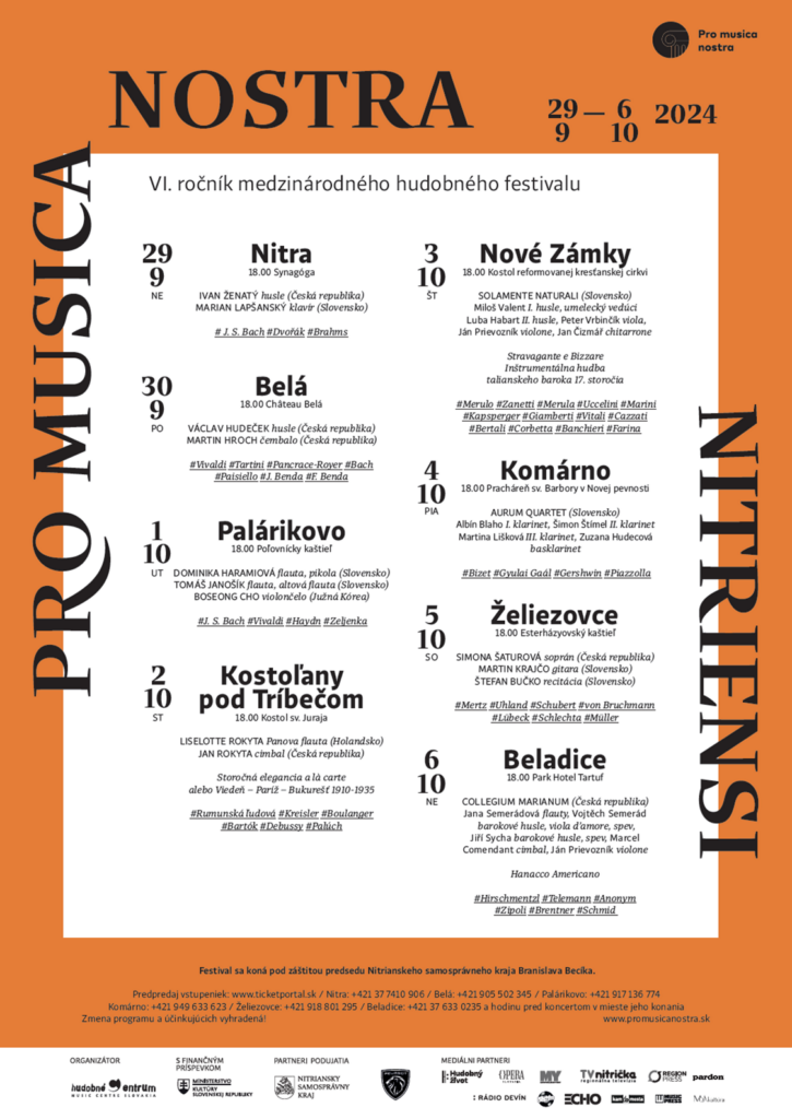 Obľúbený medzinárodný hudobný festival Pro musica nostra Nitriensi zavíta túto jeseň už po šiestykrát do Nitrianskeho kraja. Nitra, Belá, Palárikovo, Kostoľany pod Tríbečom, Nové Zámky, Komárno, Želiezovce a Beladice ožijú komornou hudbou rôznych období a krajín v podaní renomovaných umelcov a hu...