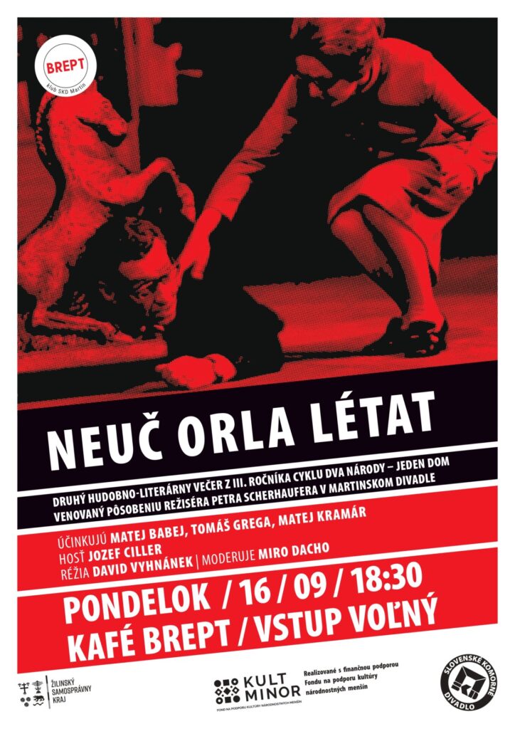 Druhý večer, 16. septembra 2024 o 18:30 hodine s názvom NEUČ ORLA LÉTAT, bude venovaný pôsobeniu režiséra Petra Scherhaufera v martinskom divadle. Rodák z Bratislavy šiel do Brna pôvodne študovať letecké konštruktérstvo, napokon prešiel na JAMU, kde absolvoval divadelnú réžiu. Na sklonku šesťdesiatych rokov sa stal spoluzakladateľom legendárneho brnianskeho Divadla Husa na provázku. K spolupráci priviedol aj scénografa Jozefa Cillera, ktorý ho, na oplátku, priviedol do vtedajšieho DSNP v Martine. Dovedna tu ako režisér pripravil päť inscenácií. Postupne sa prepracoval k československej špičke, bol autorom veľkých projektov či paradivadelných akcií, pedagógom, spoluorganizátorom a tvorcom slovenského amatérskeho divadla.