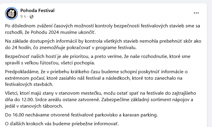 Počas silnej búrky spadol veľký stan, na festivale zasahovali všetky záchranné zložky. Pohodu napokon organizátori predčasne ukončili. Hovorili sme s účastníkmi festivalu, ktorí nám popísali paniku pod stanom. Vyčíňanie počasia ohrozilo už nejeden festival, aj na Slovensku, napokon, v minulosti a...