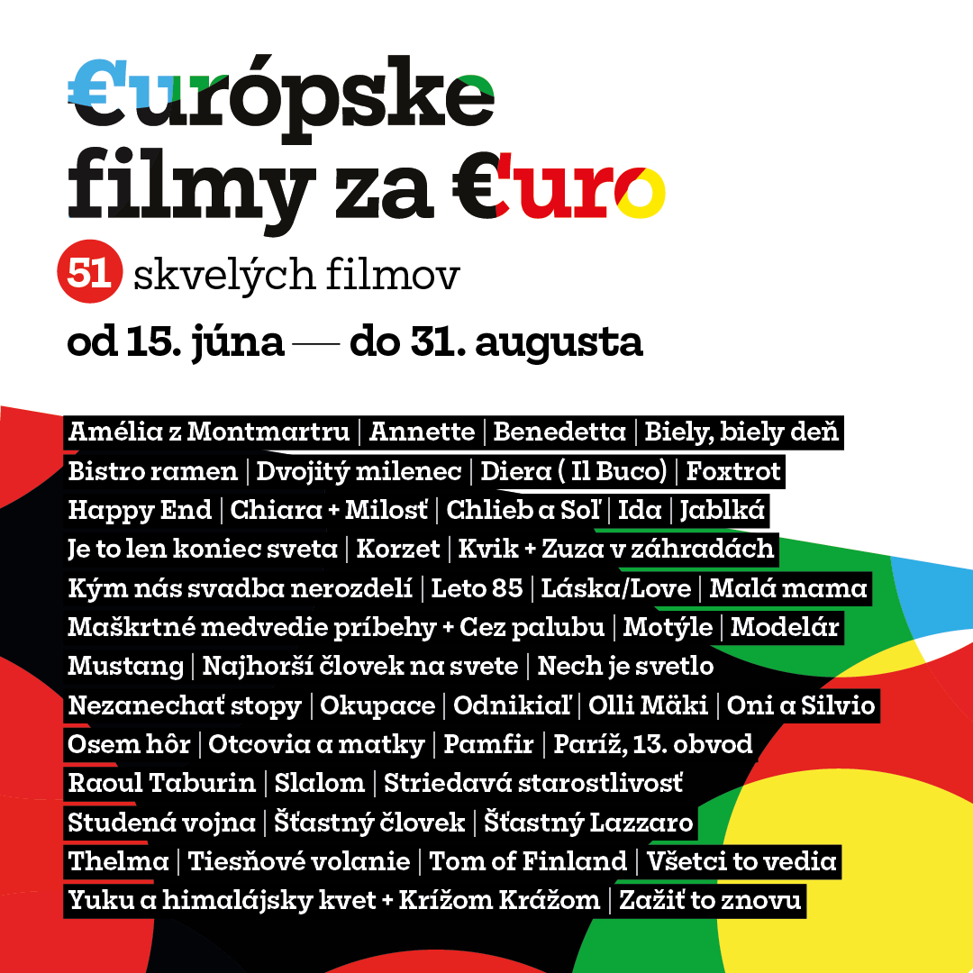 Kompletný zoznam Európskych filmov za euro: Amélia z Montmartru (2001), Annette (2021), Benedetta (2021), Biely, biely deň (2019), Bistro Ramen (2018), Dvojitý milenec (2017), Diera (2021), Foxtrot (2017), Happy End (2017), Chiara (2021), Chlieb a soľ (2022), Ida (2013), Jablká (2020), Je to len koniec sveta (2016), Kvik (2022), Korzet (2022), Kým nás svadba nerozdelí (2017), Leto 85 (2020), Love (2015), Malá mama (2021), Maškrtné medvedie príbehy (2020), Motýle (2014), Modelár (2020), Mustang (2015), Najhorší človek na svete (2021), Nech je svetlo (2019), Nezanechať stopy (2021), Okupace (2021), Odnikiaľ (2017), Olli Mäki (2016), Oni a Silvio (2018), Osem hôr (2022), Otcovia a matky (2022), Pamfir (2022), Paríž, 13. obvod (2021), Raoul Taburin (2018), Slalom (2020), Striedavá starostlivosť (2017), Studená vojna (2018), Šťastný človek (2023), Šťastný Lazzaro (2018), Thelma (2017), Tiesňové volanie (2018), Tom of Finland (2017), Všetci to vedia (2018), Zažiť to znovu (2019), Yuku a himalájsky kvet (2022)
