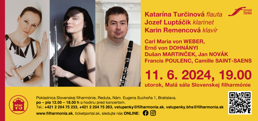 Malá sála Slovenskej filharmónie bude patriť v utorok 11. júna 2024 trom slovenským interpretom – flautistke Kataríne Turčinovej, 1.klarinetistovi orchestra SF Jozefovi Luptáčikovi a klaviristke Karin Remencovej. Spolu sa predstavia v komornom repertoári pre túto zaujímavú kombináciu nástrojov....