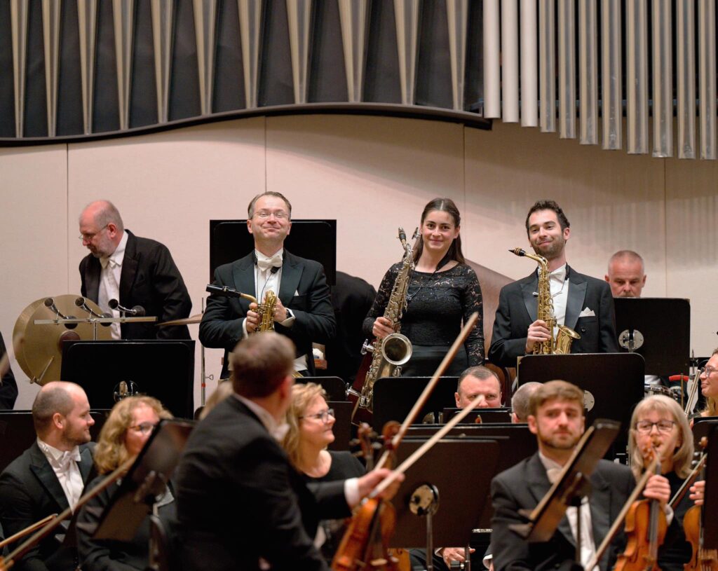 Ak bluesovú hudbu interpret cíti, a najmä pozná jej históriu a výraz, s akým sa tieto frázy majú hrať, razom to poslucháč spozná. Priestor si zasluhujú aj saxofóny pod vedením Ladislava Fančoviča. Jeho Pressburg Saxophone Quartet rastie interpretačne čoraz do lepších kvalít – v hľadisku sme videli týchto hráčov. A najmä počuli. Sprievod saxofónov počas legendárneho, nostalgického trúbkového sóla bol vyvážený, mal v sebe tú pulzáciu, aké toto dielo má mať. Rovnako tak téma. Fančovič je klasický aj jazzový muzikant, vie presne viesť spodnú líniu, nad ktorou v dokonalej symbióze v saxofónoch jeho kolegov znel tematický materiál. Dokonca saxofóny boli počuť aj v neskoršej gradácii, hoci dynamická hladina bola často cez čiaru, tú farbu skrátka nenahradí žiaden nástroj klasického orchestra.