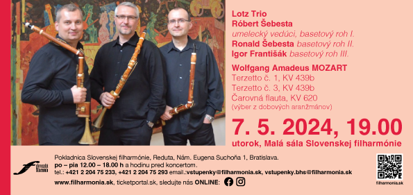 V rámci cyklu Stará hudba privítame v Malej sále SF v utorok 7. mája komorné zoskupenie LOTZ TRIO – trio basetových rohov, na ktorých budú hrať Róbert Šebesta, Ronald Šebesta a Igor Františák. Program zaznie na kópiách unikátnej sady Lotzových basetových rohov z hradu Krásna hôrka. Formácia je pom...