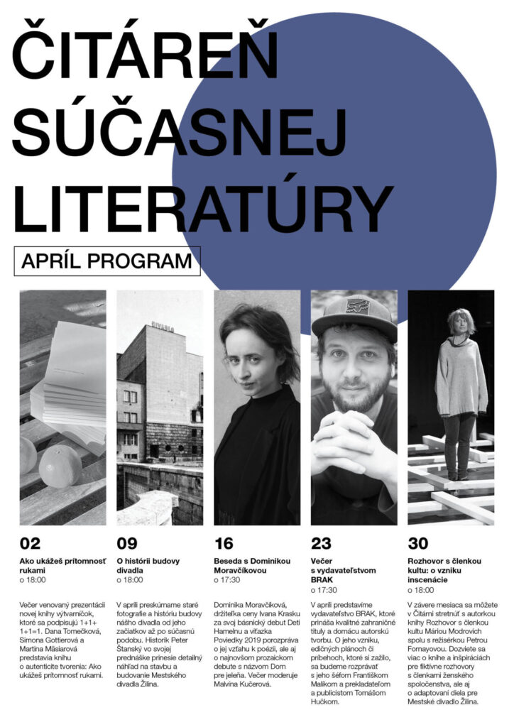 Čitáreň súčasnej literatúry v Mestskom divadle Žilina bude v apríli patriť vydavateľstvu BRAK, divadlo čakajú dve premiéry – divadelná premiéra politického pamfletu“ Toto je stred Európy, moja drahá!, filmová premiéra Lilith aj dve zaujímavé hosťujúce predstavenia. V sobotu 13. apríla odpremiéruje...