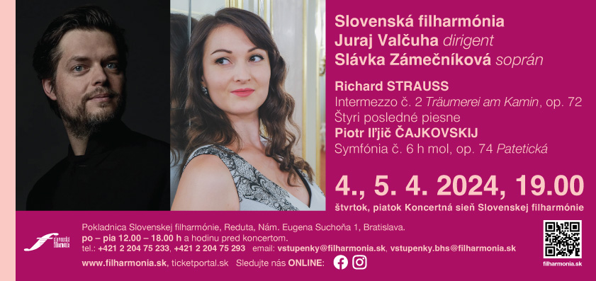 Symfonické koncerty v Slovenskej filharmónii pokračujú vo štvrtok a piatok 4. a 5. apríla o 19.00. Slovenská filharmónia sa predstaví pod taktovkou svetovo uznávaného slovenského dirigenta s medzinárodným renomé Juraja Valčuhu. Po boku orchestra sa predstaví mladá slovenská sopranistka Slávka Záme...